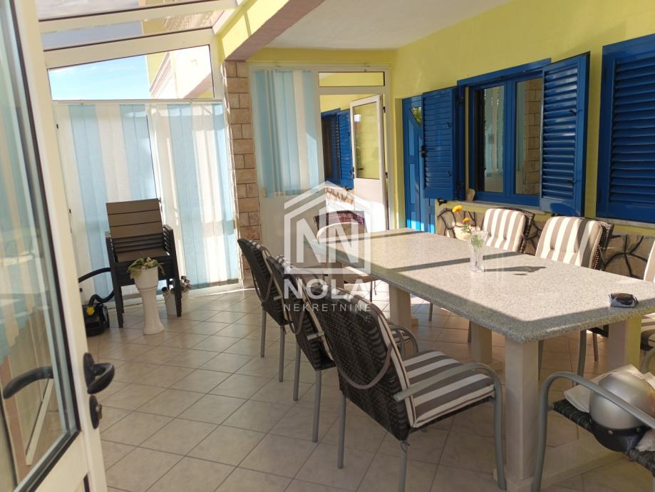 Tu na 100 metara od mora smjestila se ova prekrasna vila sa 8 apartmana i jednim velikim stanom (za vlasnika) u potpunosti ukusno i funkcionalno opremljena, sa lijepom i vrlo održavanom okućnicom.