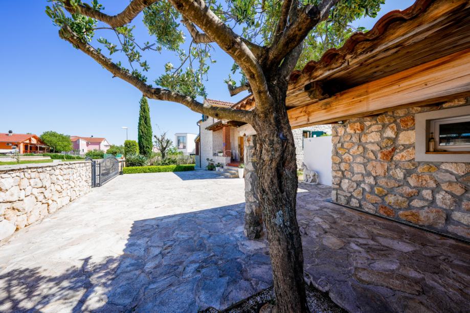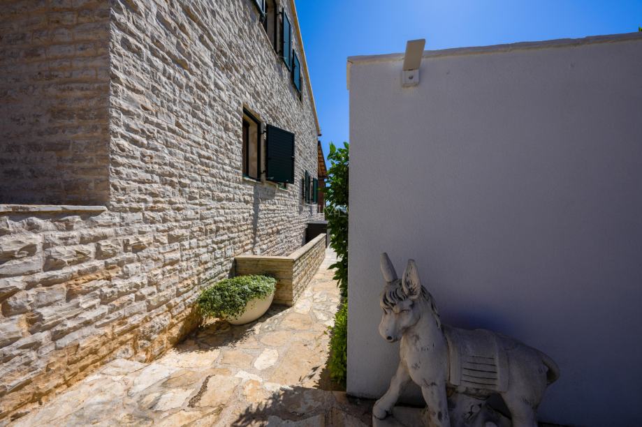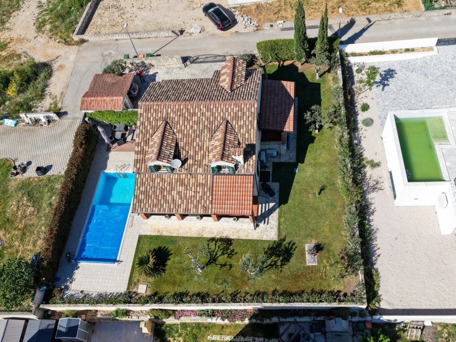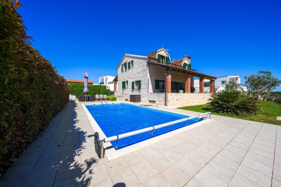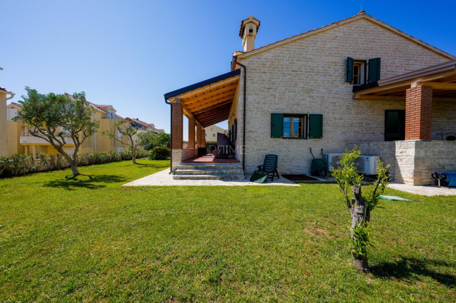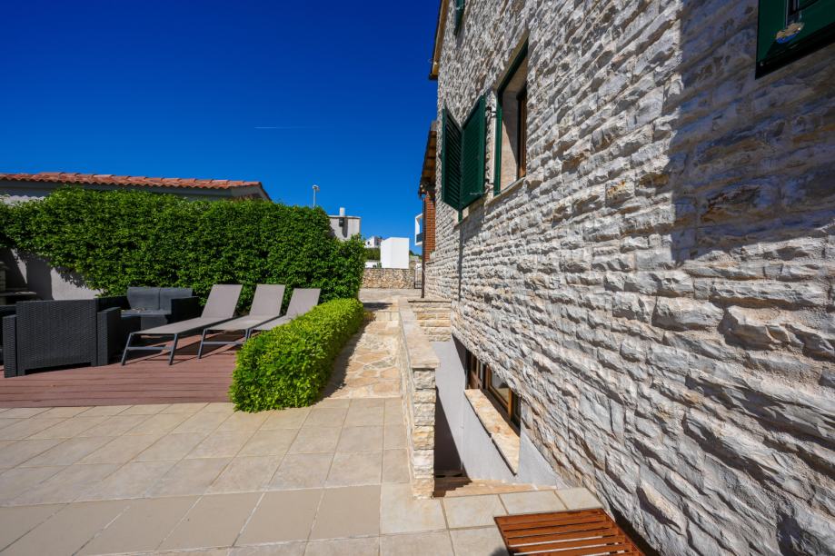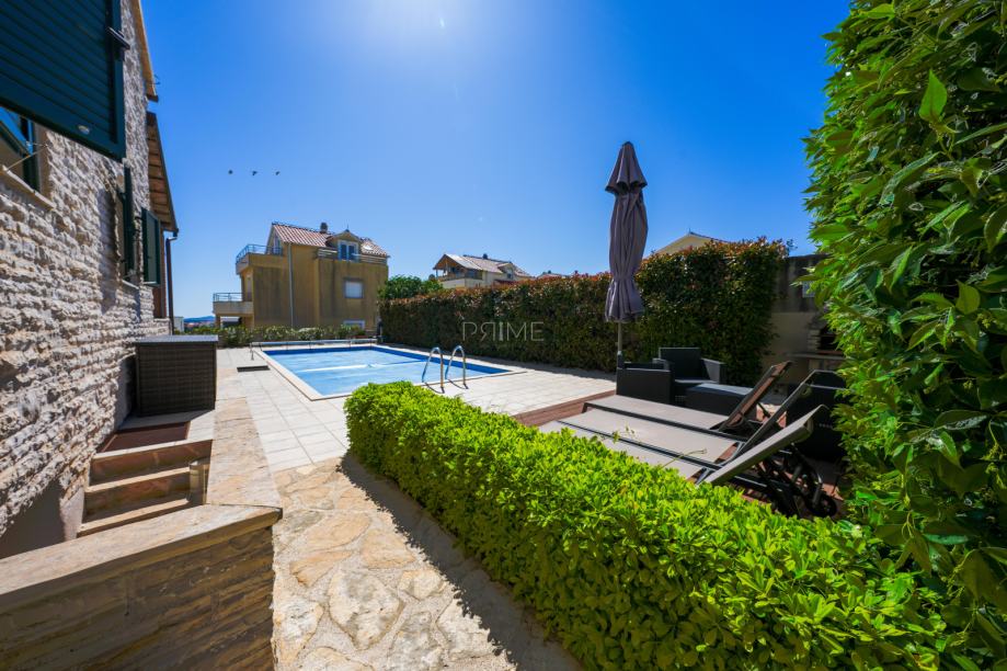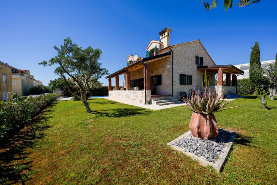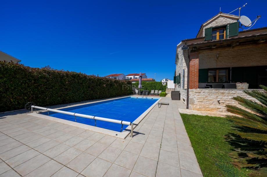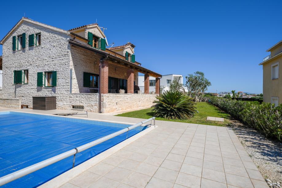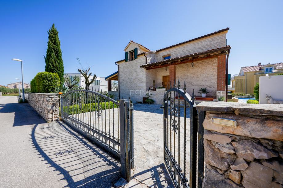 Prekrasna kamena vila površine 397 m2 izgrađena je na zemljištu površine 800 m2. Sastoji se od tri etaže podruma, prizemlja i kata. U podrumu se nalazi prostor za druženje, igraona, wellnes ( sauna), kupaona i strojarnica. Prizemlje se sastoji od kuhinje, blagovaone, dnevnog boravka, kupaone i spavaće sobe dok se na prvome katu nalaze dvije spavaće sobe i velika kupaona. U dvorištu se nalazi grijani bazen (38 m2), okućnica je prekrasno uređena i održavana. Nalazi se na mirnoj lokaciji u okruženju novoizgrađenih vila. Udaljenost od mora i najbliže plaže je 1500 metara. Prodaje se kompletno namještena i opremljena. Više informacija dajemo na upit!