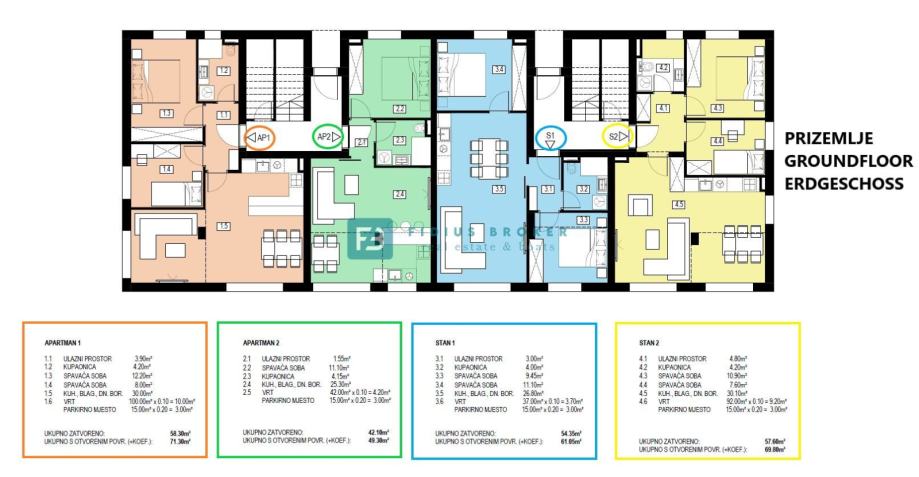 Stan S1 ukupne korisne površine 61,05 m2 (stambena površina 54,35 m2 + vrt 37 m2 + parking 15 m2) nalazi se u prizemlju. Stan funkcionalnog rasporeda sastoji se od ulaznog prostora, kupaonice, dvije spavaće sobe, kuhinje s blagovaonicom, dnevnog boravka koji ima izlaz na terasu i vrt površine 37 m2. Stanu pripada jedno parkirno mjesto. Cijena iznosi 180.000 € (Kupac je oslobođen plaćanja 3% poreza na promet nekretninama).