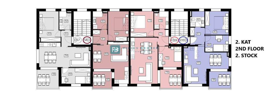 Stan S8 ukupne korisne površine 51,70 m2 (stambena površina 43,90 m2 + lođa 6,40 m2 + parking 15 m2) nalazi se na 2. katu. Stan funkcionalnog rasporeda sastoji se od ulaznog prostora, kupaonice, spavaće sobe, kuhinje s blagovaonicom, dnevnog boravka koji ima izlaz na terasu 6,40 m2 s koje se pruža pogled na more. Stanu pripada jedno parkirno mjesto.