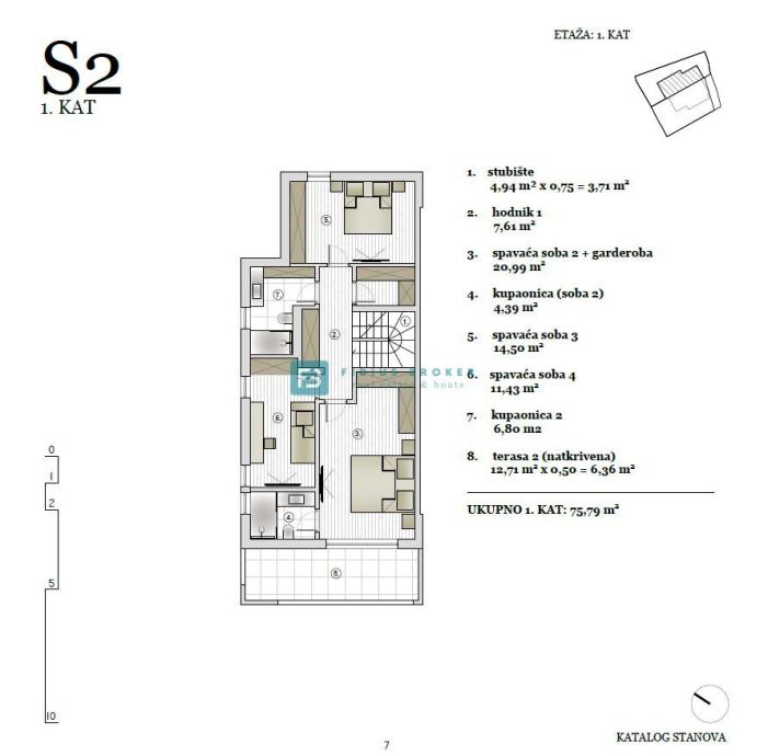 Dvojna kuća S2 funkcionalnog i prostranog rasporeda ima 224,73 m2 ukupne neto korisne površine (184,41 m2 stambene površine + bazen površine 22 m2 + dvorište površine 125,26 m2 + parking površine 23,14 m2). Proteže se na tri razine i sastoji se od: prizemlje + 1. kat + krovna terasa. U prizemlju površine 78,78 m2 nalazi se natkriveni ulaz, ulazni prostor, spavaća soba, kupaonica, kuhinja s blagovaonicom i dnevnim boravkom s izlazom na natkrivenu terasu površine 14,29 m2. Velika klizna stijena pruža lijepi pogled na vrt i grijani bazen površine 22 m2 sa sunčalištem. Unutarnje stubište vodi na kat površine 75,87 m2 gdje se nalazi hodnik, glavna spavaća soba s vlastitom kupaonicom, garderobom i natkrivenom terasom površine 12,71 m2, dodatne dvije spavaće sobe i kupaonica. Stepenice nastavljaju do krovne terase površine 29,84 m2 s koje se pruža lijepi pogled na more i okolicu. Opremljena je priključcima za vodu i struju, koja se može preurediti u opuštajuću oazu s jacuzzijem, idealnu za uživanje na otvorenom. Kuća posjeduje jedno parkirno mjesto.
