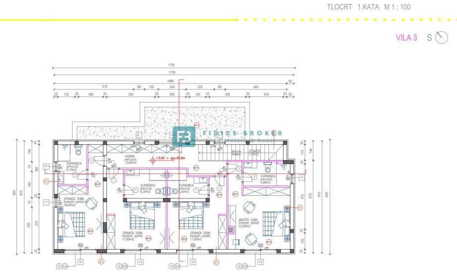 KAT - bruto/neto površina = 119,50 m2 / 119,50 m2 sastoji se od stubišta, hodnika, tri spavaće sobe s vlastitim kupaonicama i master spavaće sobe s vlastitom kupaonicom.