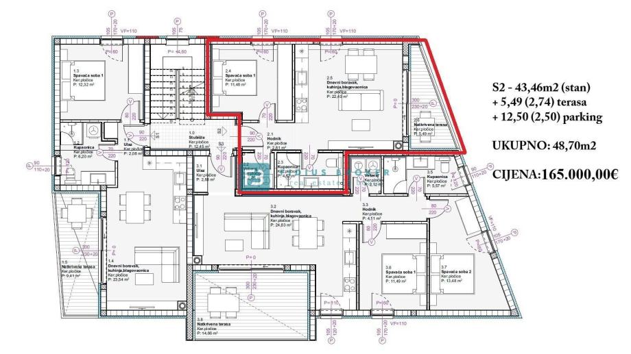 Stan S2 ukupne korisne površine 48,70 m2 (stambena površina 43,46 m2 + terasa 5,49 m2 + parking 12,50 m2) nalazi se na 1. katu. Stan funkcionalnog rasporeda sastoji se od hodnika, kupaonice, spavaće sobe, praonice, kuhinje s blagovaonicom, dnevnog boravka koji ima izlaz na terasu površine 5,49 m2. Stanu pripada jedno parkirno mjesto. Cijena iznosi 165.000 €.