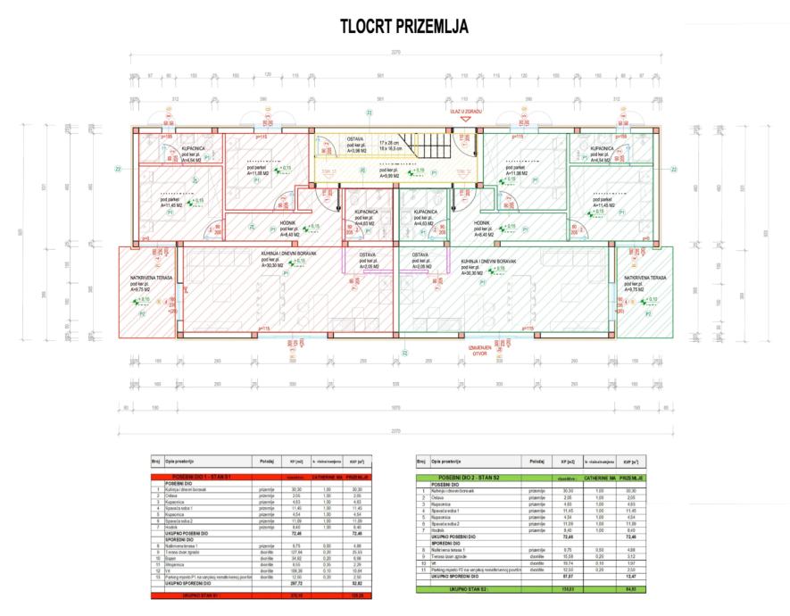 S1 (prizemlje): 72.46 m2 unutarnji prostor, 9.75 m2 natkrivena terasa, 34.92 m2 bazen, 6.55 m2 strojarnica, 127.64 m2 uređena terasa/sunčalište, 106.36 m2 vrtni prostor, 12.50 m2 parkirno mjesto, za 125.28 m2 neto stambene površine s uračunatim koeficijentima, po cijeni od € 295.000.