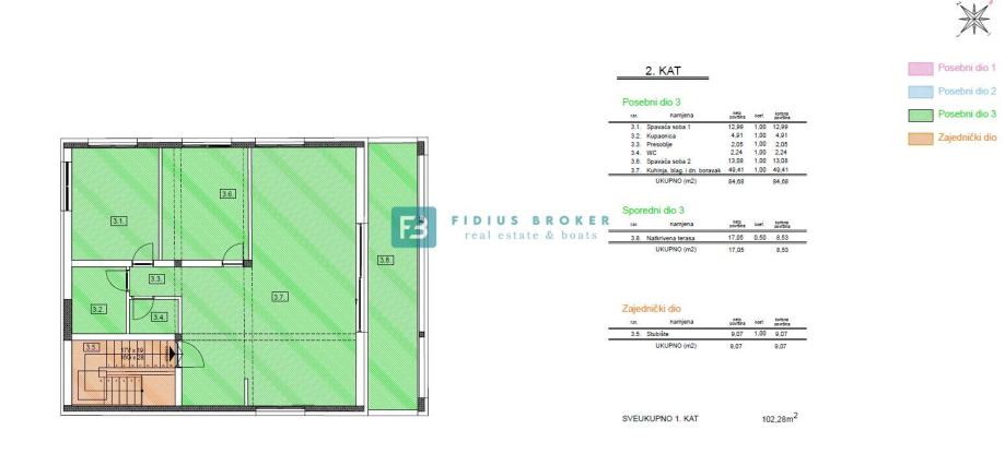 U prizemlju se smjestio stan koji je u potpunosti namješten i opremljen. Sastoji se od predsoblja, tri spavaće sobe, dvije kupaonice, kuhinje s blagovaonicom i dnevnim boravkom s izlazom na terasu i vrt. Na 1. katu se nalazi komforan stan koji se sastoji od ulaznog predsoblja, hodnika, tri spavaće sobe od kojih svaka ima izlaz na terasu, dva WC-a, kupaonice, spremišta, praonice, prostranog dnevnog boravka s kuhinjom i blagovaonicom, lođe i vlastite velike terase površine 54,03 m2 koja okružuje stan. Na 2. katu nalazi se prostran stan koji se sastoji se od ulaznog predsoblja, dvije komforne spavaće sobe, WC-a, kupaonice, prostrane kuhinje s blagovaonicom i dnevnog boravka koji ima izlaz na natkrivenu terasu površine 17,05 m2. Svaki stan ima zaseban ulaz i vlastito brojilo za vodu i struju