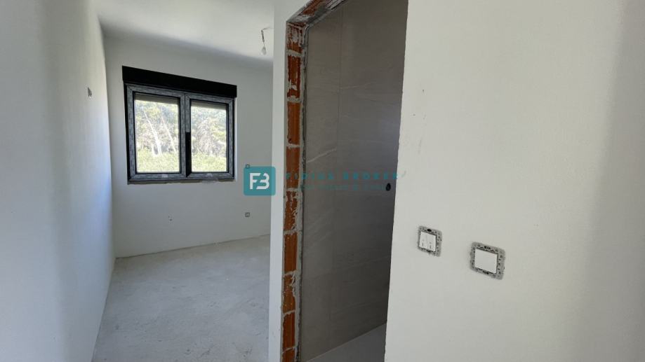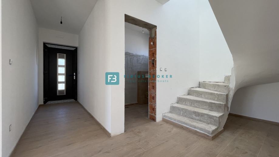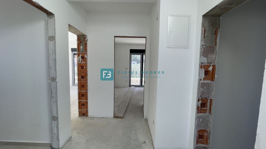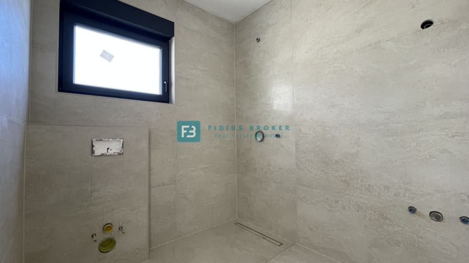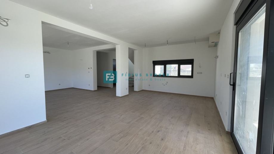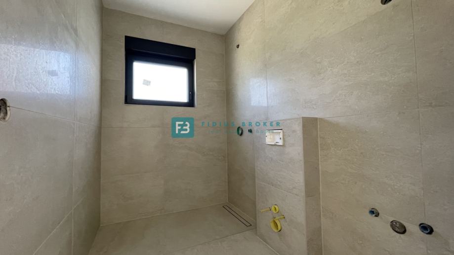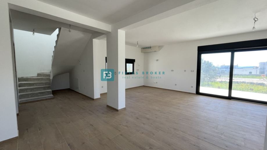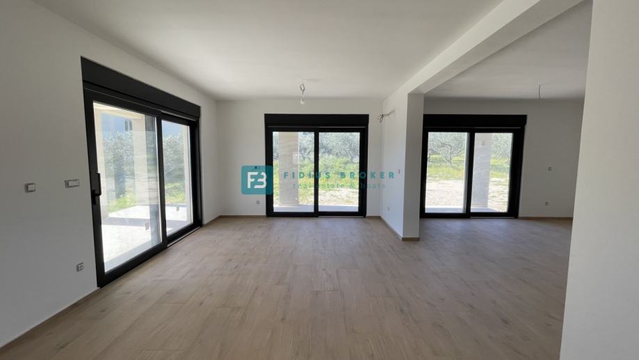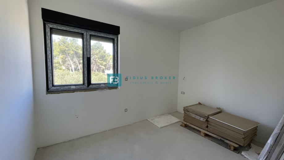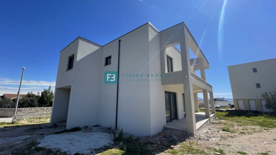 Samostojeća vila modernog dizajna i funkcionalnog rasporeda neto površine 187,33 m2 biti će izgrađena na zemljištu površine 619 m2. Proteže se na dvije etaže : prizemlje + kat. U prizemlju se nalazi ulazni hodnik, WC, spremište s vanjskim ulazom, prostrana kuhinja s blagovaonicom i dnevni boravak s izlazom na natkrivenu terasu gdje se smjestio bazen površine 24 m2m sunčalište i prostrani vrt. Unutarnje stubište vodi na kat gdje se nalazi praonica, tri komforne spavaće sobe s vlastitim kupaonicama, od kojih dvije imaju izlaz na vlastitu terasu s prekrasnim pogledom na more. U lijepom uređenom dvorištu s mnoštvom zelenila nalazit će se i popločani dio za parking cca 100 m2 gdje će biti moguće smjestiti više automobila. Kuća će biti priključena na gradsku kanalizaciju.