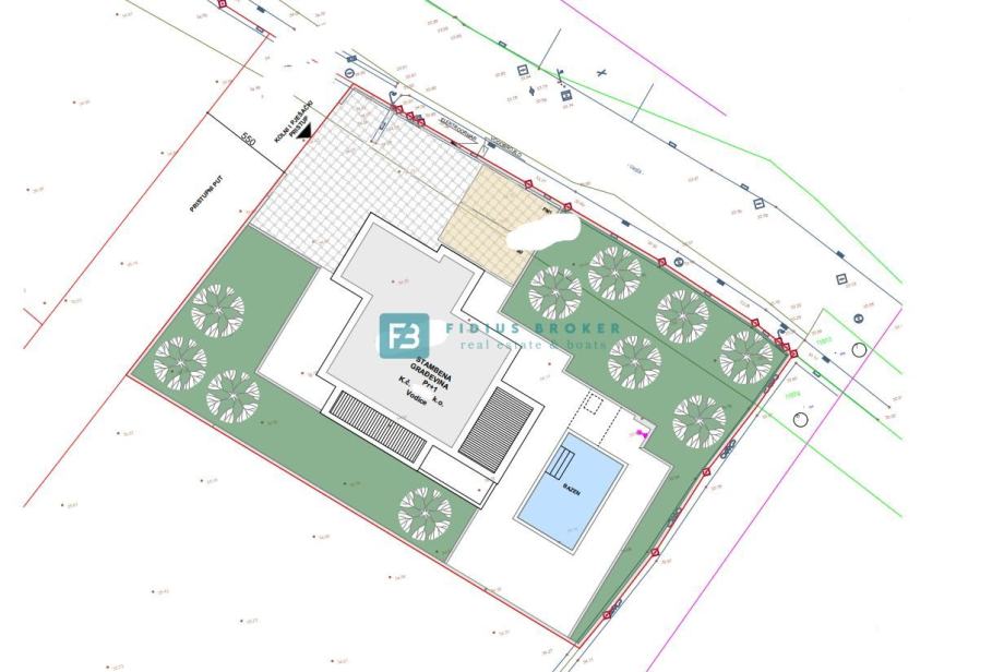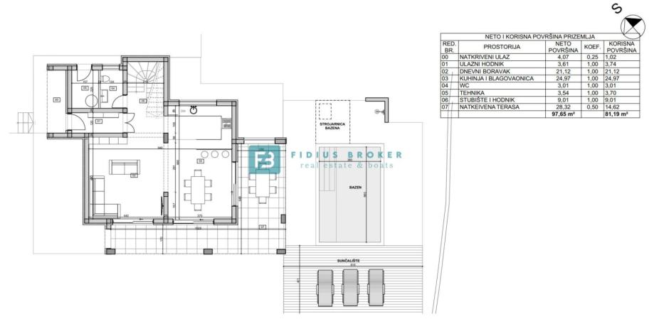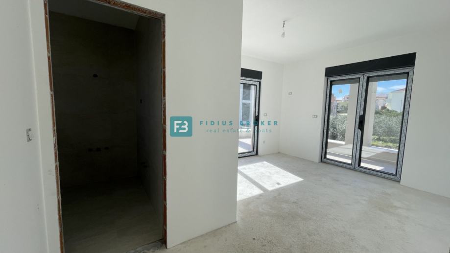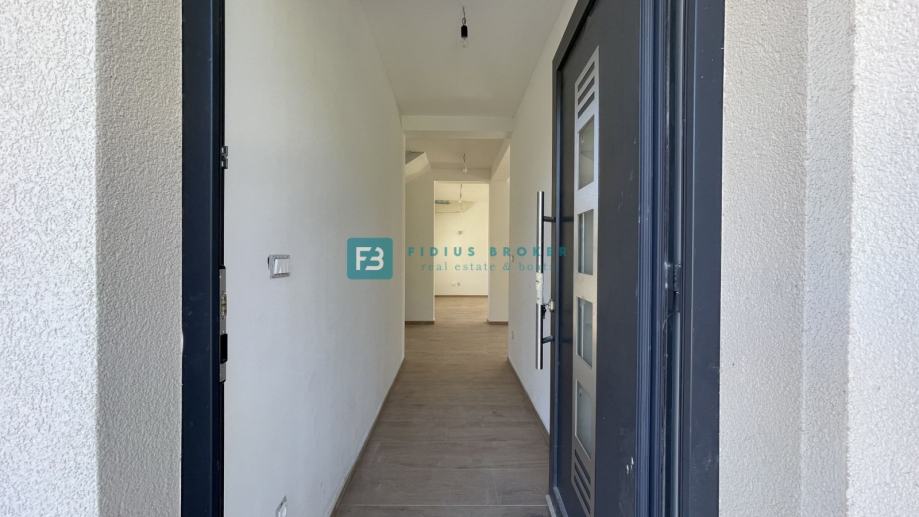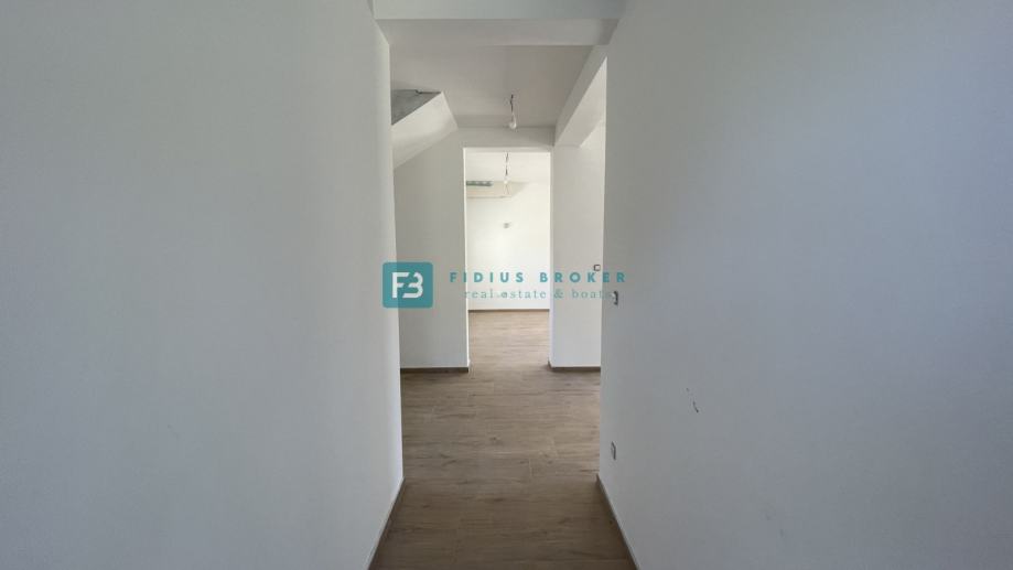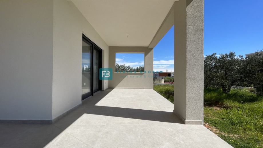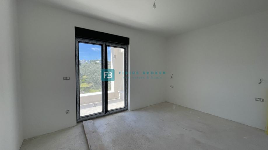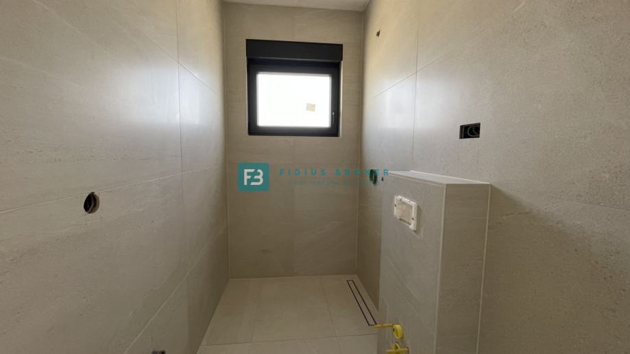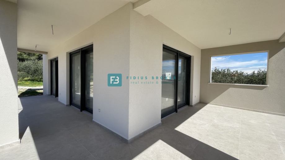 Samostojeća vila modernog dizajna i funkcionalnog rasporeda neto površine 187,33 m2 biti će izgrađena na zemljištu površine 619 m2. Proteže se na dvije etaže : prizemlje + kat. U prizemlju se nalazi ulazni hodnik, WC, spremište s vanjskim ulazom, prostrana kuhinja s blagovaonicom i dnevni boravak s izlazom na natkrivenu terasu gdje se smjestio bazen površine 24 m2m sunčalište i prostrani vrt. Unutarnje stubište vodi na kat gdje se nalazi praonica, tri komforne spavaće sobe s vlastitim kupaonicama, od kojih dvije imaju izlaz na vlastitu terasu s prekrasnim pogledom na more. U lijepom uređenom dvorištu s mnoštvom zelenila nalazit će se i popločani dio za parking cca 100 m2 gdje će biti moguće smjestiti više automobila. Kuća će biti priključena na gradsku kanalizaciju.