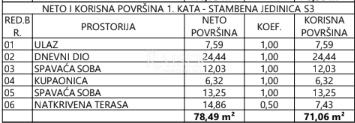 Stan, oznake S3, nalazi se na prvom katu zgrade i nudi ukupnu neto korisnu površinu od 71,06 m². Pažljivo osmišljen raspored prostorija osigurava maksimalnu iskoristivost prostora i ugodan boravak.