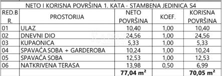 Stan, oznake S4, nalazi se na prvom katu zgrade i nudi ukupnu neto korisnu površinu od 70,05 m². Pažljivo osmišljen raspored prostorija osigurava maksimalnu iskoristivost prostora i ugodan boravak.