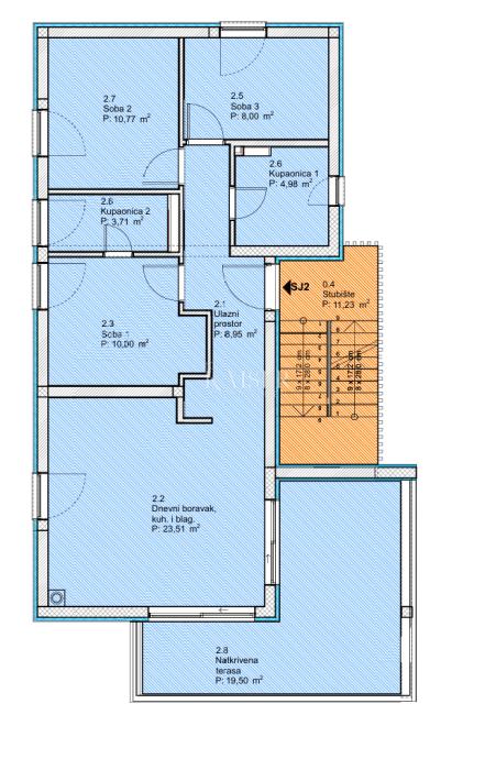 Stan, oznake SJ2, nalazi se na prvom katu zgrade i nudi ukupnu stambenu površinu od 69,86 m². Pažljivo osmišljen raspored prostorija osigurava maksimalnu iskoristivost prostora i ugodan boravak, s naglaskom na otvorenost i svjetlost.