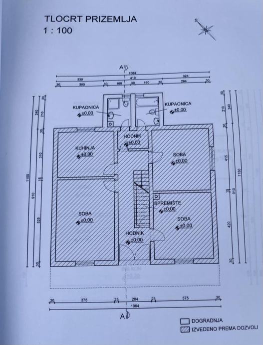 Prizemlje kuće sastoji se od ulaznog prostora, hodnika, kuhinje, dnevnog boravka, 2 spavaće sobe, 2 kupaonice, unutarnjeg stubišta i terase.