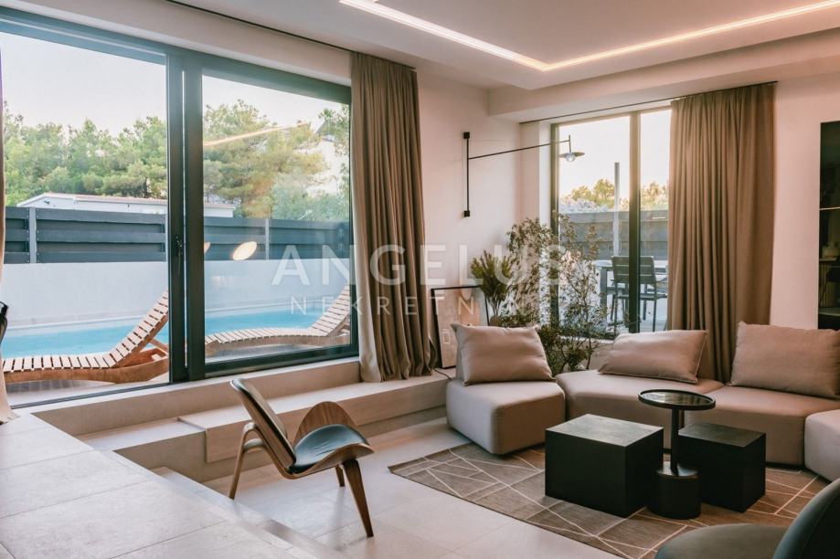 Angelus nekretnine Vam predstavljaju novu modernu vilu sa bazenom smještenu u Srimi, udaljenu 300 m od mora