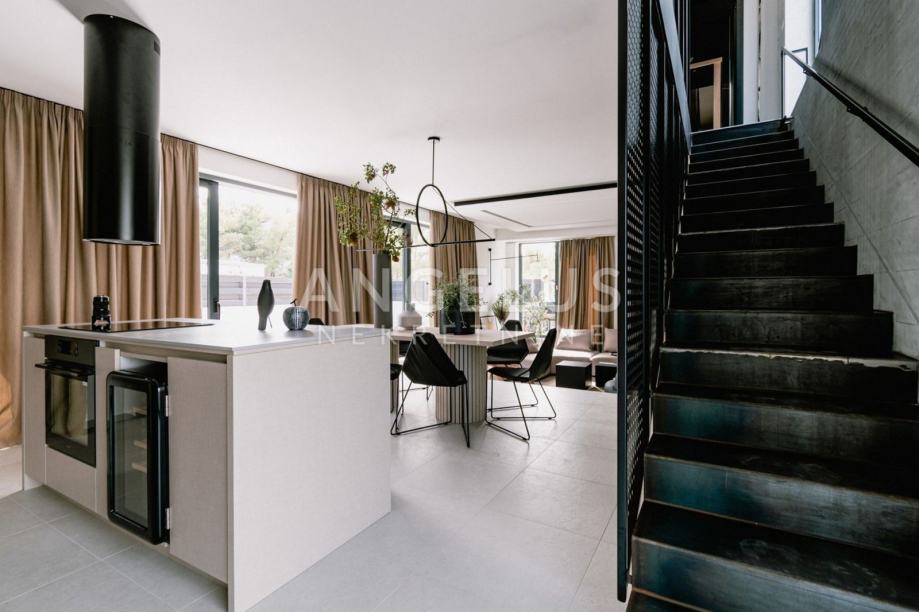 From the outdoor terrace with a pool and deck chairs, you can enter the ground floor of the villa through a large glass wall, which is divided into a fully equipped kitchen with a dining area and a comfortable living room. Due to the large glass walls, the entire space is permeated with light, which makes it seem even more spacious and airy.
