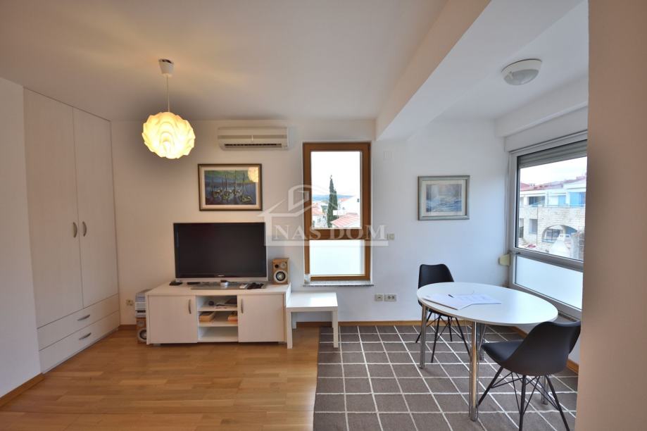 Vodice, Srima - prodaje se studio apartman na prvom katu zgrade površine 27m2 . Stan se sastoji od ulaza, kupaonice i dnevnog boravka s kuhinjom .Stan je kompletno namješten i klimatiziran , te mu pripada jedno parkirno mjesto u dvorištu zgrade koje je ograđeno . Zgrada se nalazi na mirnoj lokaciji , drugi red od mora , 140 m udaljena od najbliže plaže a od Centra Vodica oko 1000m.