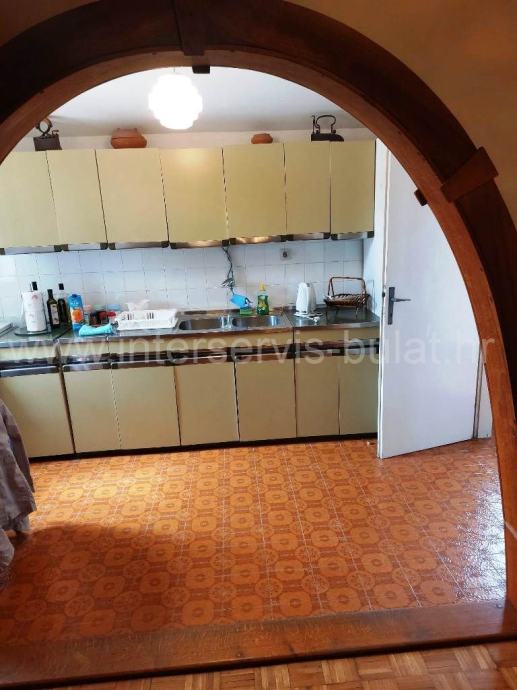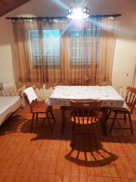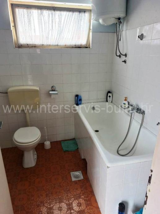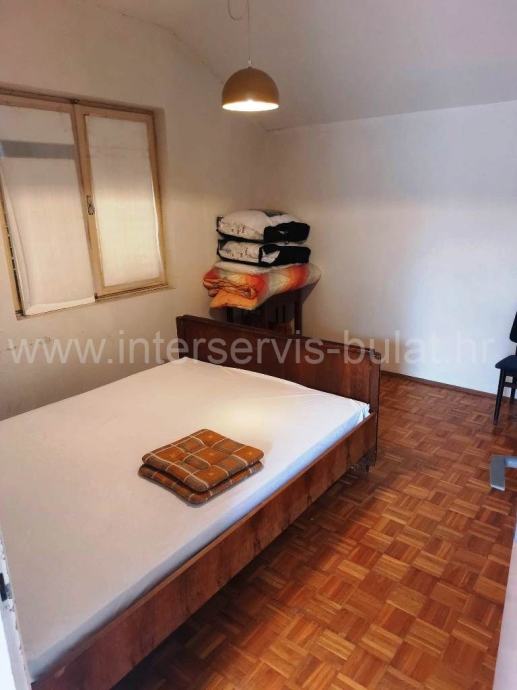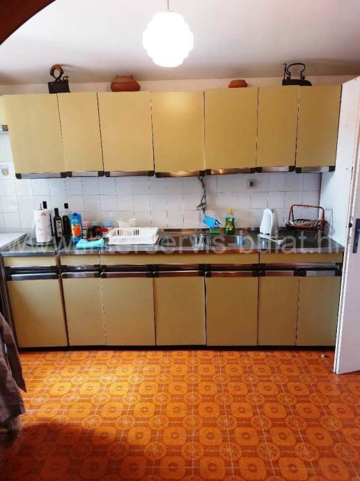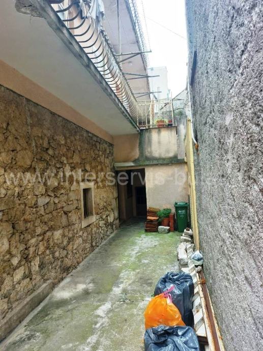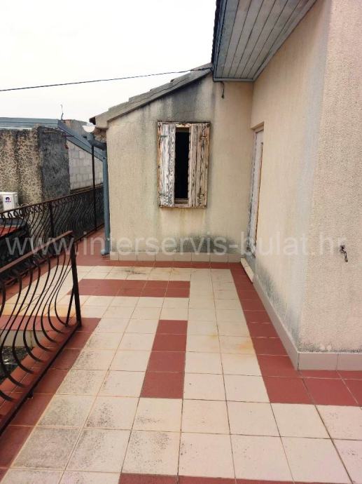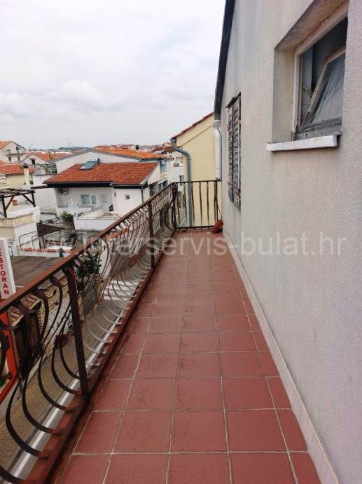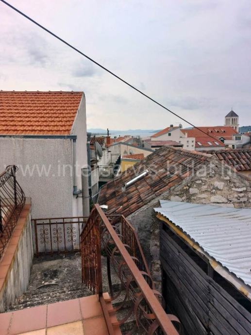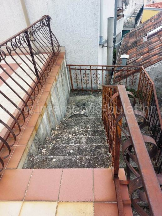 Na odličnoj lokaciji u Vodicama nalazi se samostojeća kuća, prizemlje, kat i visoko potkrovlje. Predmet prodaje je poslovni prostor u prizemlju kuće i stan u visokom potkrovlju. Poslovni prostor korisne površine 96m2 u jednom dijelu + manja ostava i toalet. S obzirom na stanje poslovnog prostora, koje zahtijeva detaljnu adaptaciju, moguća je i prenamjena u komforan stan. Vanjske stepenice vode za visoko potkrovlje gdje se nalazi stan od 70m2 korisne površine. Stan je useljiv, ali zahtijeva ulaganja. Ima veliku terasu od 50 m2 i balkon oblika „L“ tako da je prekrasan pogled na more zajamčen.