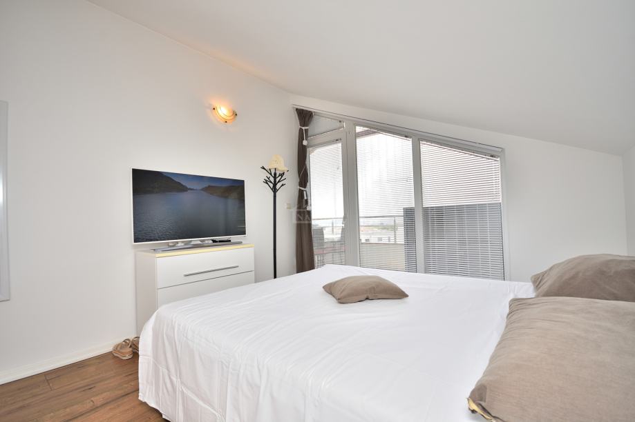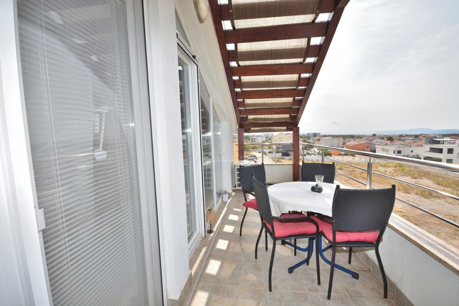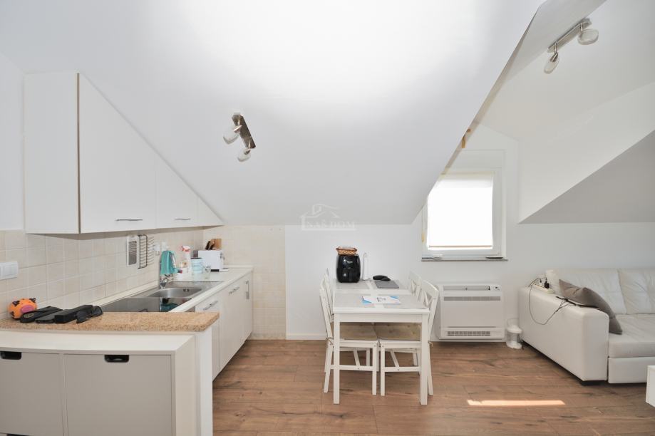Vodice- prodaje se lijepo uređeni stan s pogledom na more. Stan se nalazi u visokom potkrovlju manje stambene zgrade s ukupno 6 stambenih jedinica. Ima neto površinu 45,61m2 i sastoji se od: ulaz, spavaća soba, kupaonica kuhinja s blagovaonicom i dnevni boravak s izlazom na terasu koja je natkrivena drvenom pergolom. Zgrada je sagrađena 2010 godine i nalazi se na mirnoj lokaciji, od centra mjesta je udaljena oko 1800 m a od plaže 2000 m.