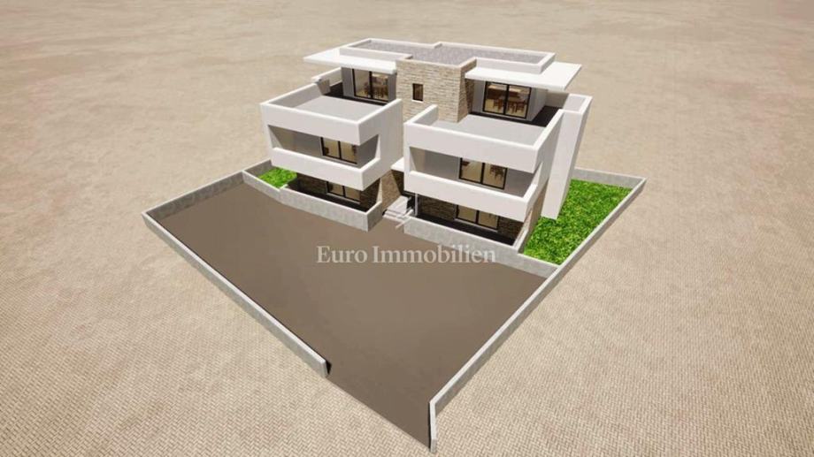 Stan se nalazi u stambenoj zgradi koja ima ukupno 4 stana. Sastoji se od kuhinje, blagovaonice, dnevnog boravka, dvije spavaće sobe, hodnika i natkrivene terase. Podno grijanje nalazi se u dnevnom boravku i kupaonici. Na drugom katu/krovnoj terasi smješteni su kuhinja, blagovaonica, WC, te natkrivena i nenatkrivena terasa. Osigurano je jedno parking mjesto. Udaljenost od mora iznosi 600 m. Stan je opremljen klimom u dnevnom boravku, dok će u sobama biti priprema za klima uređaje. Plaćanje po fazama gradnje.