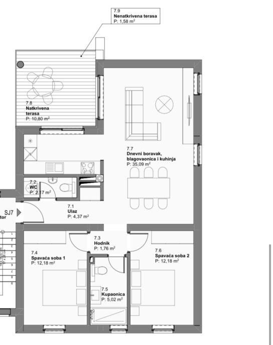 Stan S7 se nalazi na 2. katu zgrade, netto korisne površine 81,50 m2 . Sastoji se od ulaznog hodnika, WC-a, kuhinje/blagovaonice/dnevnog dijela otvorenog tlocrta sa izlazom na terasu, kupaonica, 2 spavaće sobe.