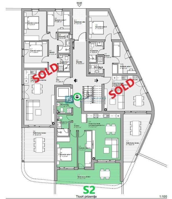 Stan S2 ukupne površine 81,21 m2 (stambena površina 59,74 m2 i terasa 21,47 m2) + vrt 45,22 m2 + parking 12,50 m2 nalazi se u prizemlju. Orijentiran je prema južnoj strani. Sastoji se od hodnika, WC s praonicom, kupaonice, dvije spavaće sobe, kuhinje s blagovaonicom i dnevnog boravaka s izlazom na natkrivenu terasu površine 21,47 m2 i vrt površine 45,22 m2. Stanu pripada parkirno mjesto u dvorištu zgrade.