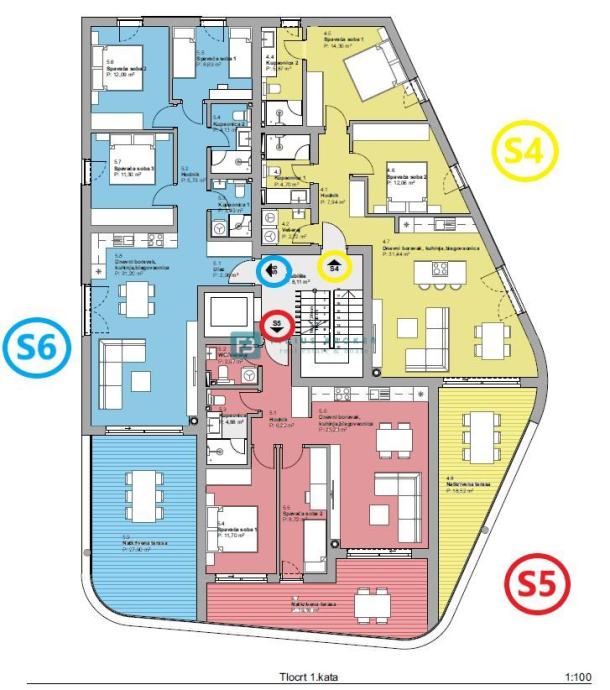 Stan S4 ukupne korisne površine 97,55 m2 (stambena površina 79,03 m2 + terasa 18,52 m2) + parking 12,50 m2 nalazi se na 1. katu. Orijentiran je prema jugoistočnoj strani. Sastoji se od hodnika, praonice, dvije spavaće sobe, dvije kupaonice, kuhinje s blagovaonicom i dnevnog boravaka s izlazom na natkrivenu terasu površine 18,52 m2 s koje se pruža lijepi pogled na more. Stanu pripada parkirno mjesto u dvorištu zgrade. Cijena iznosi 380.000 € (PDV uključen - kupac je oslobođen plaćanja 3% poreza na promet nekretninama).