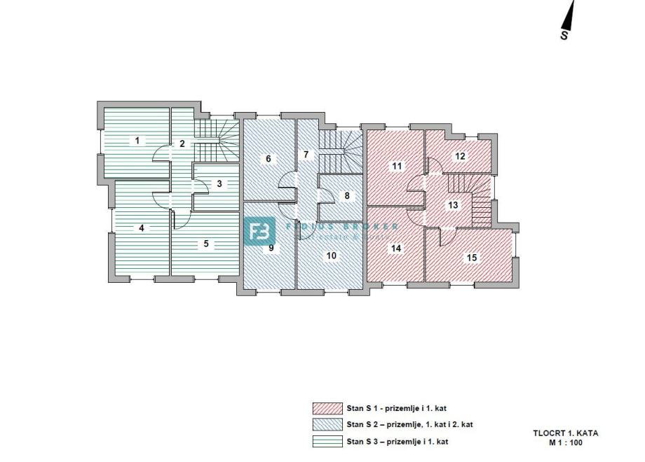 Kuća S1 ukupne korisne površine 115,11 m2 + okućnica 11,59 m2 (4,53 m2 + 7,06 m2) + 2 parking mjesta sastoji se od 2 etaže: prizemlje + kat. U prizemlju se nalazi ulaz, kupaonica, prostran dnevni boravak s kuhinjom i blagovaonicom s izlazom na natkrivenu terasu površine 10,03 m2 i nenatkrivenu terasu površine 23,56 m2. Unutarnje stubište vodi do kata gdje se nalaze hodnik, tri spavaće sobe i kupaonica. Kući pripadaju dva parkirna mjesta oznake P1 i P2. Cijena: 379.000 €.