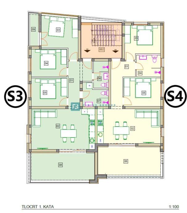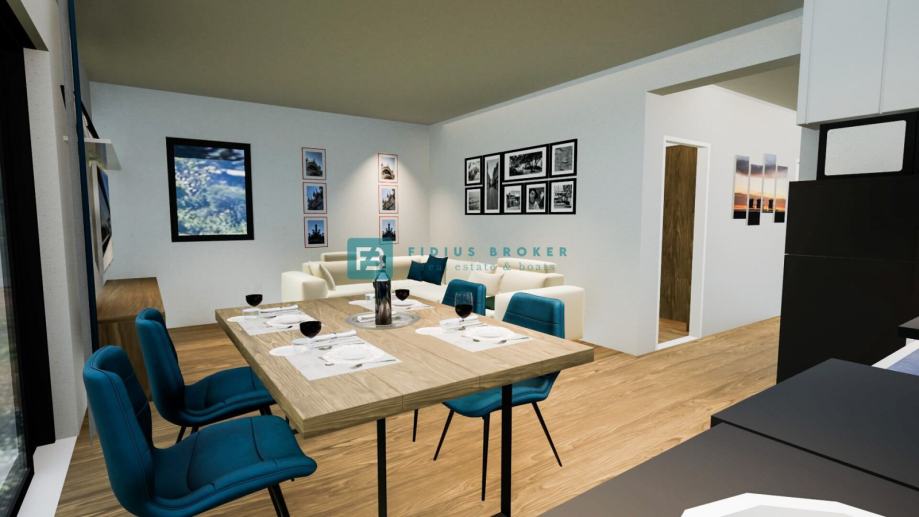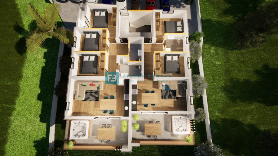 Upravo je završena i useljiva stambena zgrada sa ukupno 6 stanova. Objekt u novogradnji sastoji se od tri etaže: prizemlje + 1. kat + 2. kat. Zgrada modernog izgleda se gradi kvalitetnim materijalima prema posljednjim standardima gradnje i biti će opremljena: stiropor fasada, protuprovalna ulazna vrata, PVC stolarija s komarnicima, staklena ograda, rolete s električnim podizačima, podno grijanje u dnevnom boravku i kupaonici, na terasama je ostavljen priključak za jacuzzi, visoko kvalitetne keramičke obloge, moderne sanitarije u kupaonici, klima uređaj u svakoj prostoriji, TV/Internet priključak u sobama i dnevnom boravku.