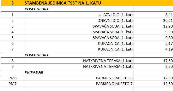 Stan S3 ukupne korisne površine 91,73 m2 (stambena površina 76,58 m2 + terase 20,30 m2 + parking 25 m2) i nalazi se na 1. katu. Sastoji se od ulaznog dijela, tri spavaće sobe od kojih jedna ima izlaz na terasu površine 2,70 m2, dvije kupaonice, kuhinje s blagovaonicom i dnevnog boravka s izlazom na terasu površine 17,60 m2 s koje se pruža lijepi pogled na more. Stanu pripada dva vanjska parking mjesta oznake PM7 i PM8. Cijena iznosi 330.000 €.