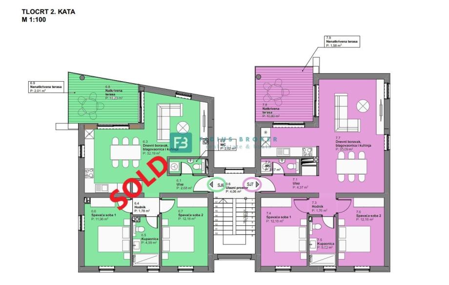 Nova stambena zgrada sa ukupno 7 stanova. Stambeni objekt modernog izgleda sastoji se od tri etaže: prizemlje + 1. kat + 2. kat. Prizemlje zauzimaju tri stana, a na 1. i 2. katu smjestilo se po dva stana. Stanovima u prizemlju pripada odgovarajući dio vrta, dok stanovi na 1. i 2. katu imaju lijepi pogled na more. Zgrada se gradi kvalitetnim materijalima prema posljednjim standardima gradnje, od opreme izdvajamo: stiropor fasada, protuprovalna/protupožarna ulazna vrata, ALU stolarija, podno grijanje u dnevnom boravku i kupaonici, klima uređaj u svakoj prostoriji, električni podizači roleta, komarnici, moderna kupaonska sanitarija, visokokvalitetne podne obloge, staklena ograda na terasama. Zgrada je završena i spremna za useljenje.