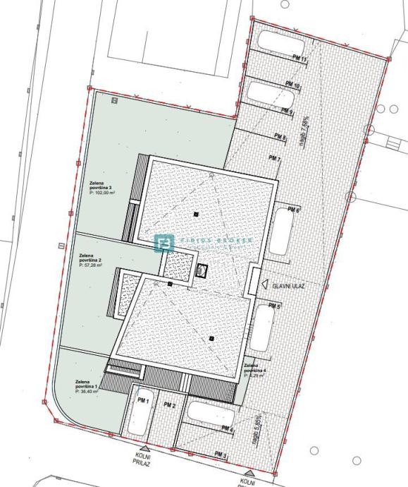 Nova stambena zgrada sa ukupno 7 stanova. Stambeni objekt modernog izgleda sastoji se od tri etaže: prizemlje + 1. kat + 2. kat. Prizemlje zauzimaju tri stana, a na 1. i 2. katu smjestilo se po dva stana. Stanovima u prizemlju pripada odgovarajući dio vrta, dok stanovi na 1. i 2. katu imaju lijepi pogled na more. Zgrada se gradi kvalitetnim materijalima prema posljednjim standardima gradnje, od opreme izdvajamo: stiropor fasada, protuprovalna/protupožarna ulazna vrata, ALU stolarija, podno grijanje u dnevnom boravku i kupaonici, klima uređaj u svakoj prostoriji, električni podizači roleta, komarnici, moderna kupaonska sanitarija, visokokvalitetne podne obloge, staklena ograda na terasama. Zgrada je završena i spremna za useljenje.