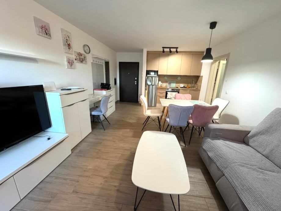 Stan se sastoji od ulaznog hodnika, prostranog dnevnog boravka s blagovaonicom i kuhinjom u open space konceptu iz kojeg se dijela izlazi na balkon, dok u nastavku imamo dvije spavaće sobe i kupaonicu do kojih se dolazi također hodnikom.
