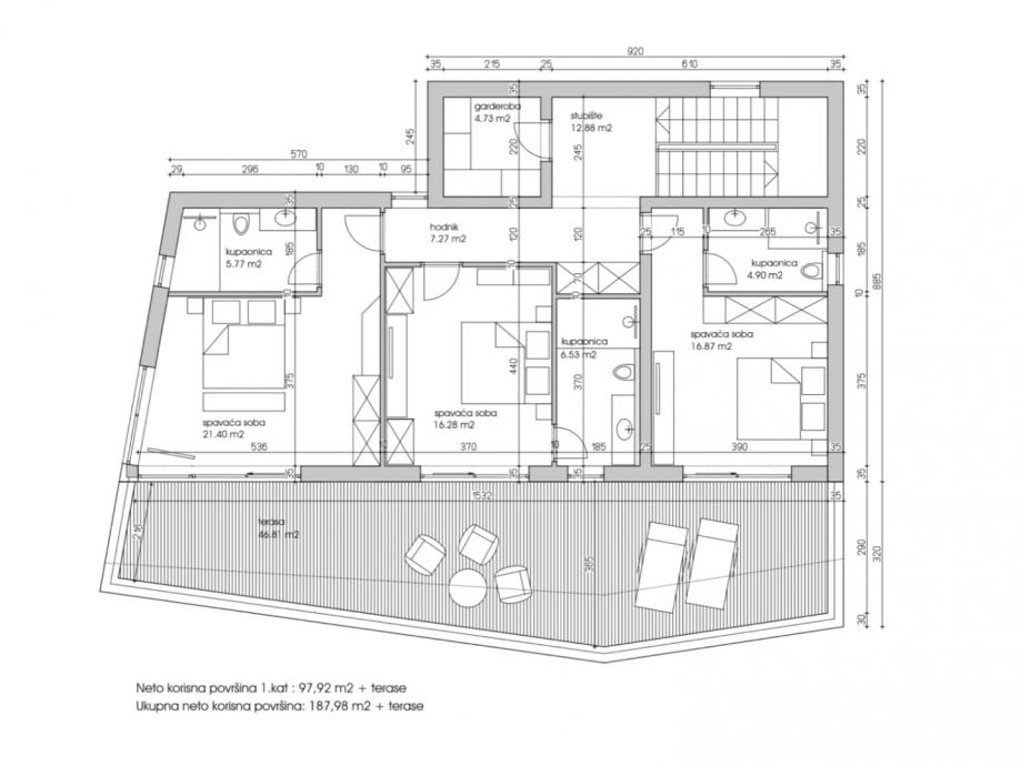 S gornje etaže planirane kuće pruža se panoramski pogled na more, što prostor čini idealnim za boravak i druženja na otvorenom.