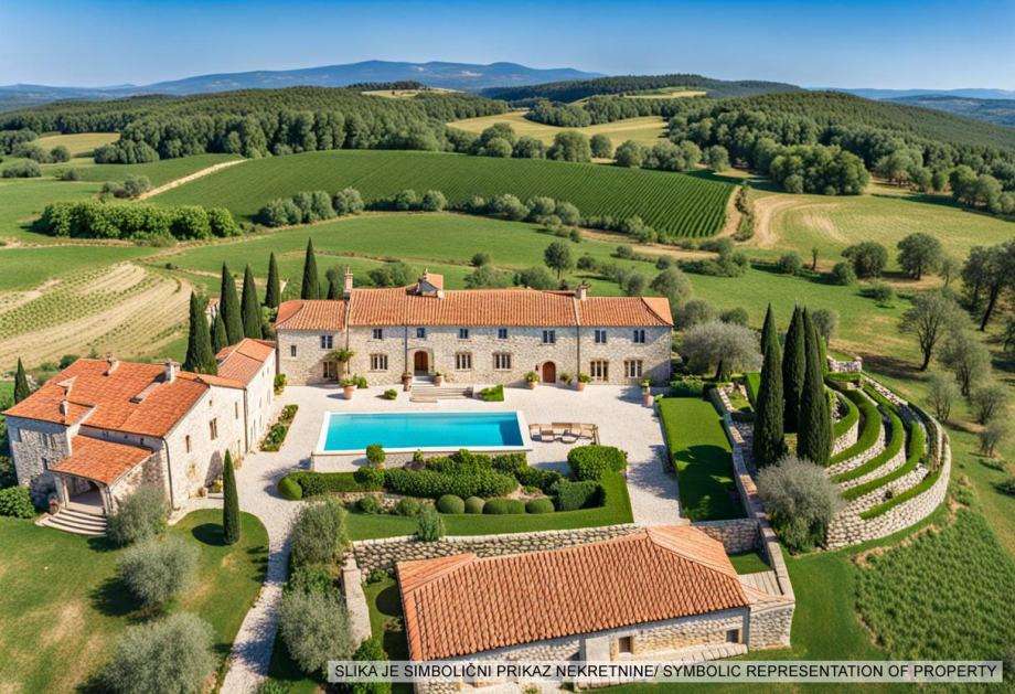 Na prodaju je ekskluzivno istarsko imanje koje se sastoji od tri rustikalne kamene kuće. Veliki vanjski bazen dominira djelomično zatvorenim posjedom.