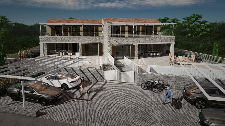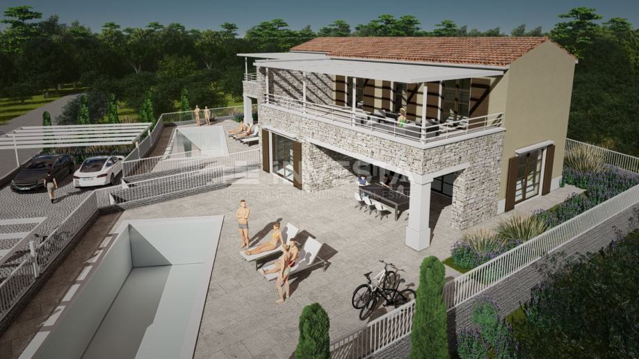 Vila se nalazi na zemljištu površine 539m2 što omogućuje prostranu kvadraturu okućnice i vanjskog prostora za druženje u kojem je predviđen bazen.