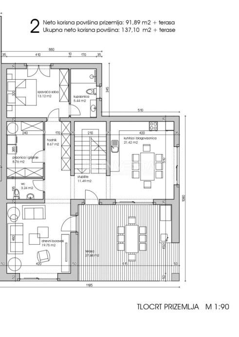 U prizemlju je smještena jedna spavaća soba s pripadajućom kupaonom, prostor za pranje i sušenje veša, toalet, kuhinja + blagavaonica koje s dnevnim boravkom imaju izlaz na prostranu terasu s blagavaonskim prostorom i ljetnom kuhinjom.