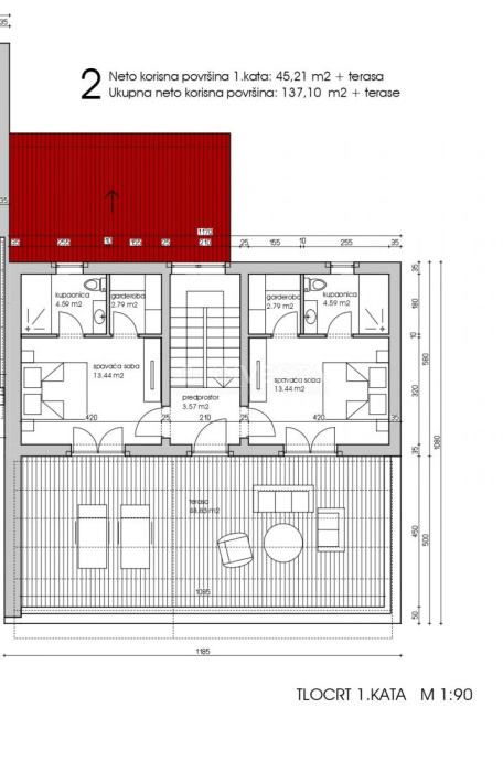Stubištem se penjemo na prvi kat na kojemu su 2 spavaće sobe svaka sa pripadajućom kupaonom i walk-in ormarom. Svaka soba ima izlaz na prostranu terasu s koje se pruža panoramski pogled na prirodu i okolinu.