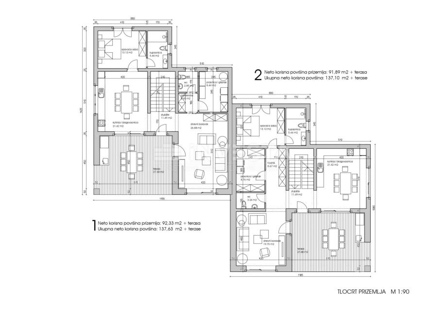 Bruto razvijena površina vile je 215 m2, a neto korisna površina 165m2 koja je podijeljena na prizemlje i prvi kat.