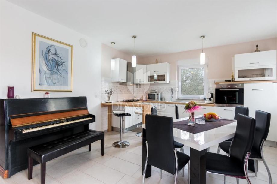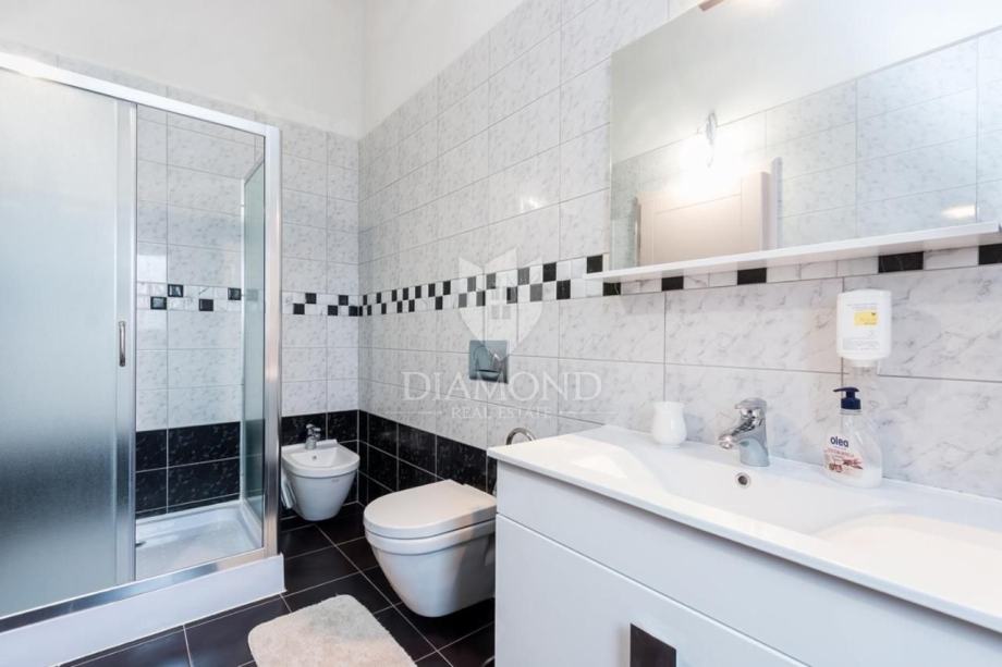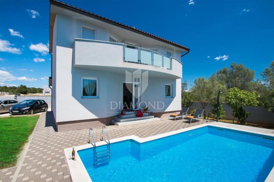 Ova lijepa nekretnina sastoji se od prizemlja i kata, ukupne površine 200 m2. Prizemlje se sastoji od komfornog dnevnog boravka sa izlazom na plažu bazena, potpuno opremljene kuhinje i blagovaonice. Tu se nalazi i gostinjski wc te spavaća soba sa vlastitom kupaonicom. Na katu se nalaze još tri spavaće sobe, sve sa vlastitom kupaonicom i balkonom sa kojeg se pruža lijepi pogled na okolni krajolik i more. Svaka spavaća soba opremljena je sa klima uređajem i satelitskim televizorom.