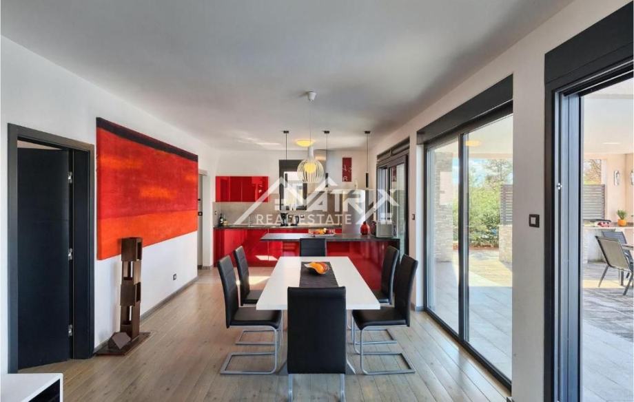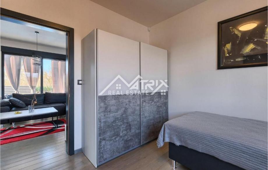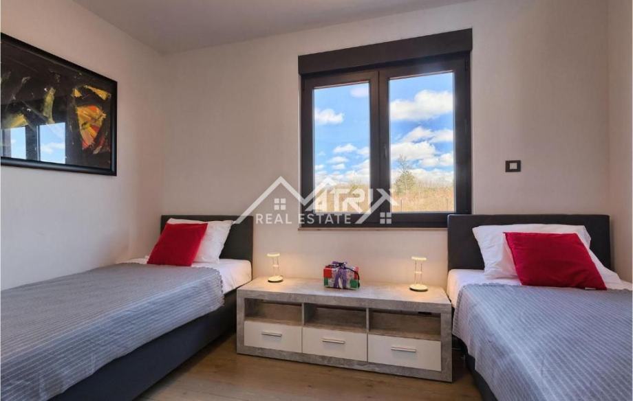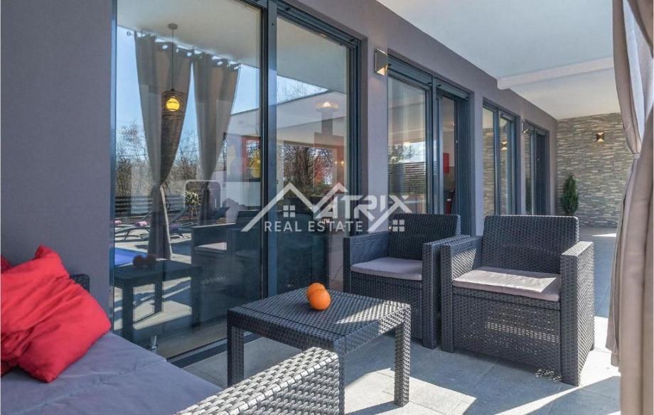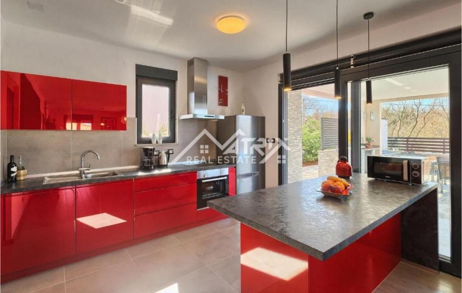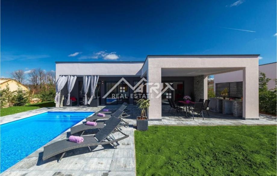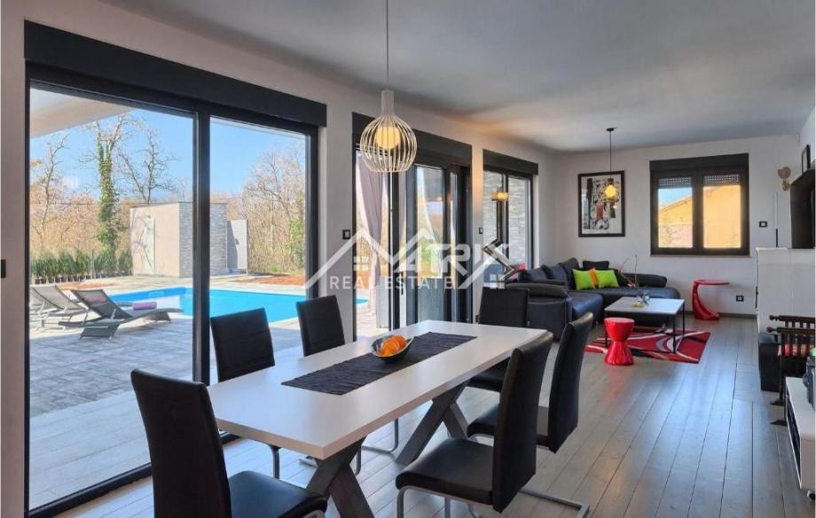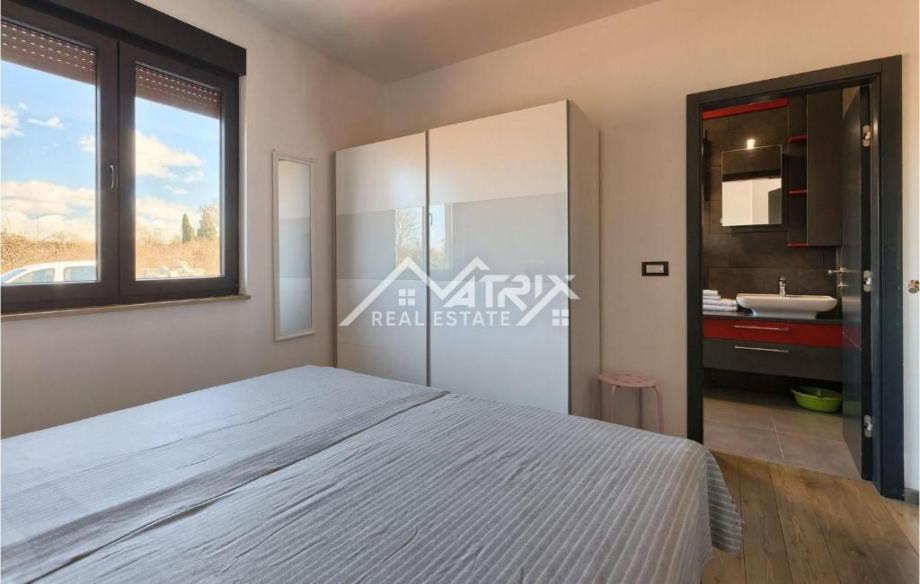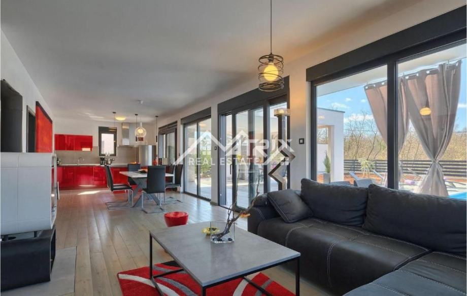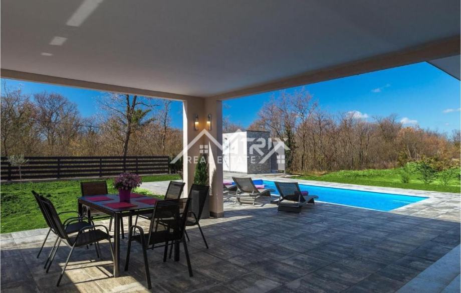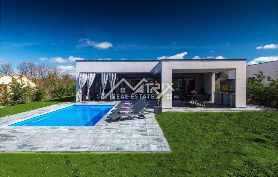 Prodaje se ova moderno uređena i potpuno namještena prizemnica s bazenom, ukupne stambene površine 141 m², smještena u mirnom istarskom naselju nedaleko od Vodnjana. Vila se nalazi na zaista izvrsnoj lokaciji – okružena zelenilom i privatnošću, a opet u neposrednoj blizini Pule i Rovinja. More je udaljeno svega 15 minuta vožnje.