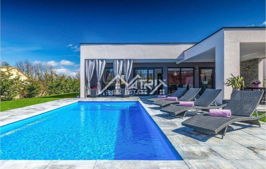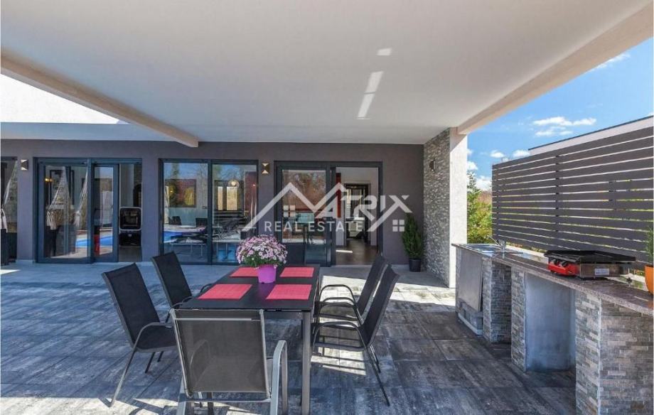 Kuća je izgrađena na lijepo uređenom i potpuno ograđenom zemljištu površine 711 m², koje pruža sve što je potrebno za opušten i bezbrižan boravak. Centralni dio okućnice zauzima bazen od 32 m² sa sunčalištem, idealan za uživanje tijekom toplih ljetnih dana. Okućnica je uređena sustavom navodnjavanja, a dodatnu vrijednost pruža prekrasna vanjska kuhinja smještena na velikoj natkrivenoj terasi od 25 m². U sklopu okućnice nalazi se i pomoćni objekt s roštiljem, sudoperom i vanjskim tušem, dječje igralište te privatni popločeni parking za najmanje dva vozila.