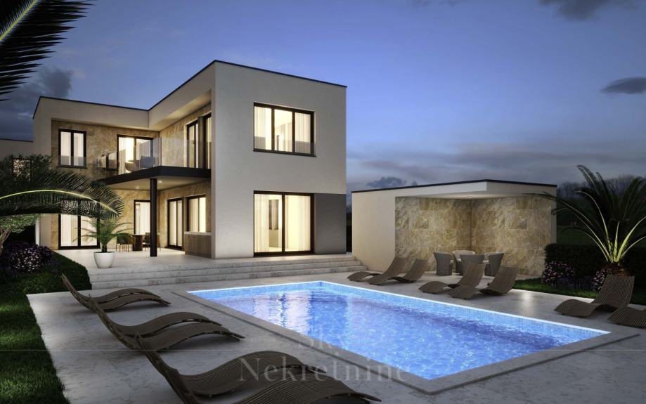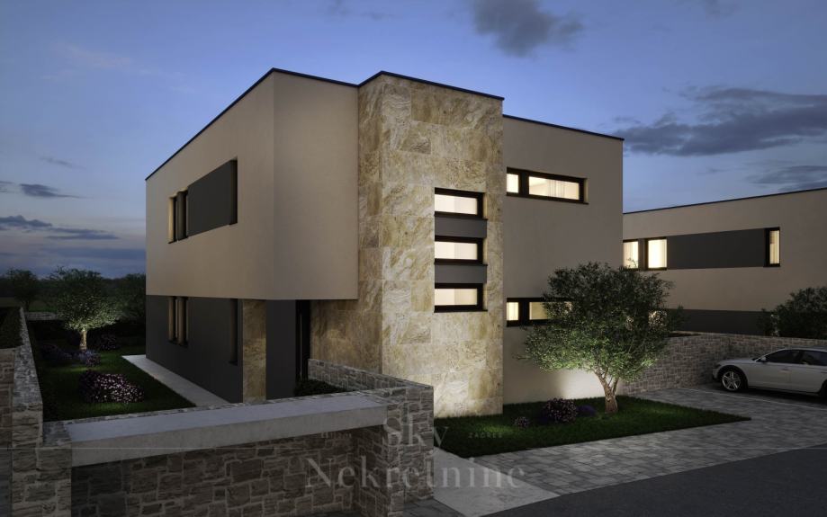 Vila je izvedena klasičnom gradnjom s opekom i betonom, koji su odlični izolatori topline. Ugrađena je ALU stolarija s 6 komora i troslojnim staklom, a fasada je obložena travertin kamenom, dok je boja fasade bež.