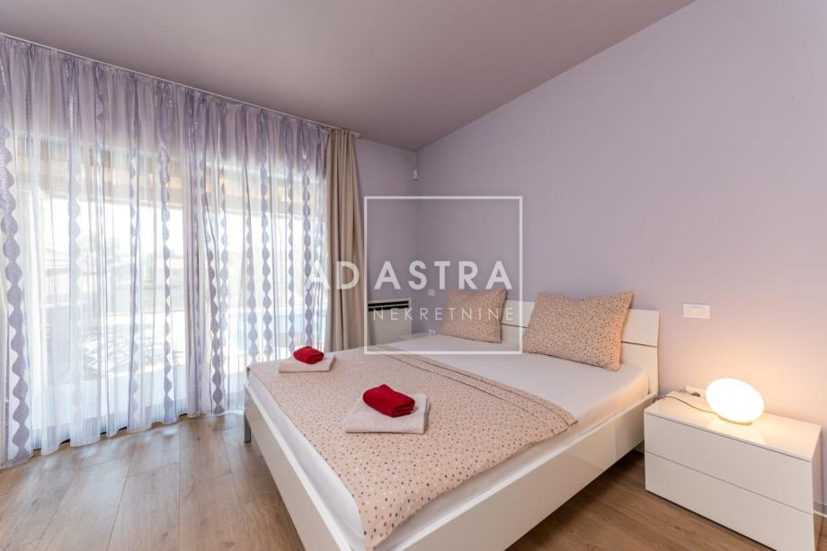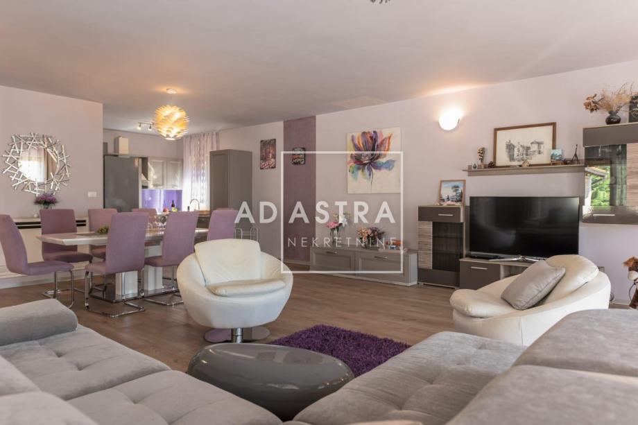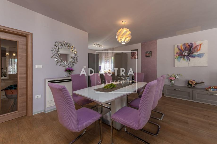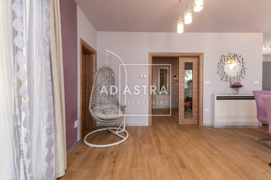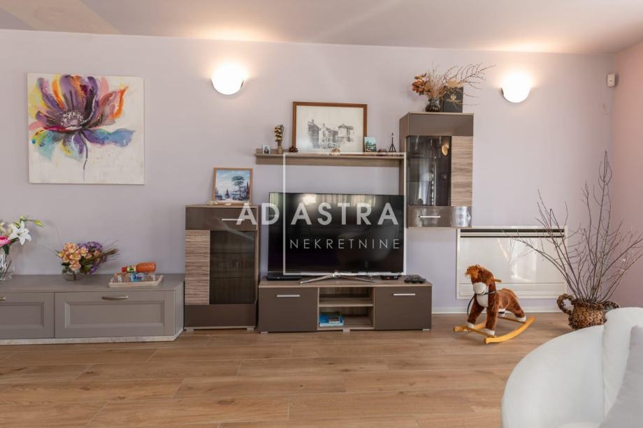 Stan se sastoji se od prostranog dnevnog boravka s kuhinjom i blagovaonom, radne sobe, tri spavaće sobe od kojih je jedna s vlastitim kupatilom te još dva dodatna kupatila i ostave. Stan obiluje svjetlošću zahvaljujući prirodnom osvjetljenju koje prodire kroz velike prozore. Posebno je vrijedno spomenuti da dnevni boravak ima izlaz na terasu koja vodi do sunčališta i bazena, pružajući dodatni prostor za uživanje u vanjskom okruženju. Uz stan dolazi i jedno parkirno mjesto (2,90 m2), garaža (9,08 m2) te spremište u podrumu (4,53 m2) za još veću praktičnost i udobnost.