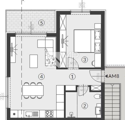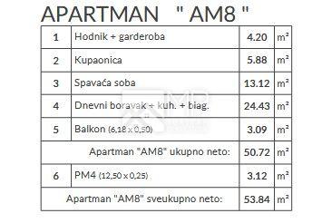 Stan oznake „AM8“ sastoji se od: hodnika+garderobe, kupaonice, jedne spavaće sobe, dnevnog boravka s kuhinjom i blagovaonicom s izlazom na balkon. Stanu pripada jedno parkirno mjesto oznake PM3. Sveukupna neto kvadratura stana iznosi 53,84 m2.