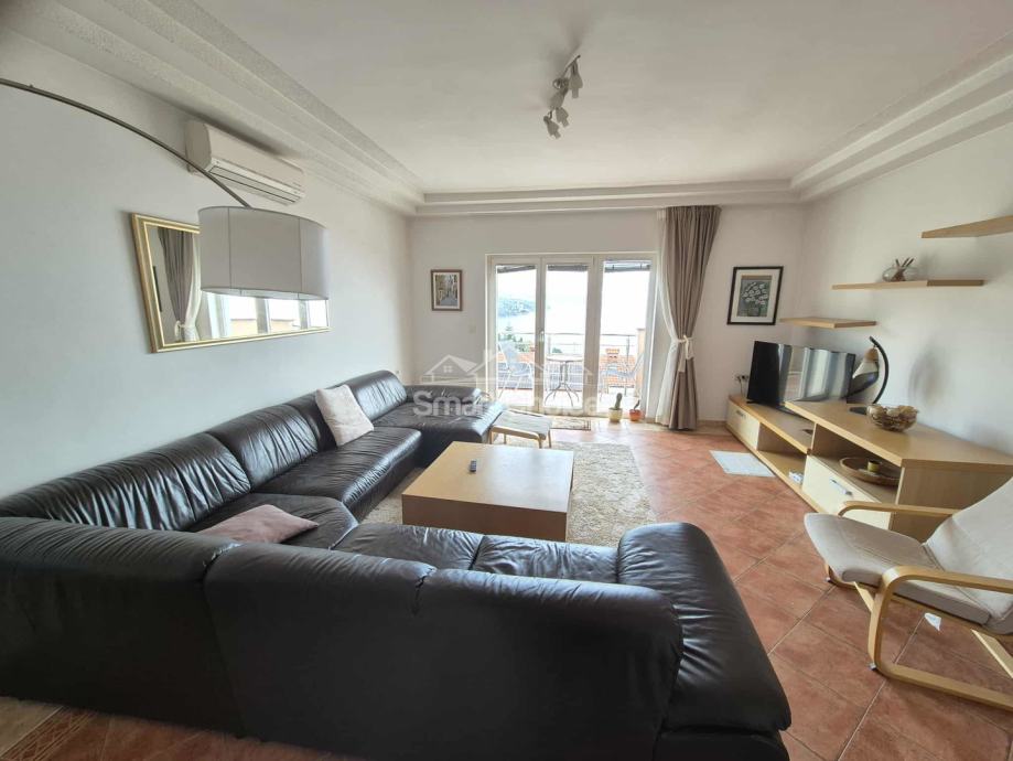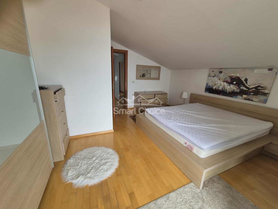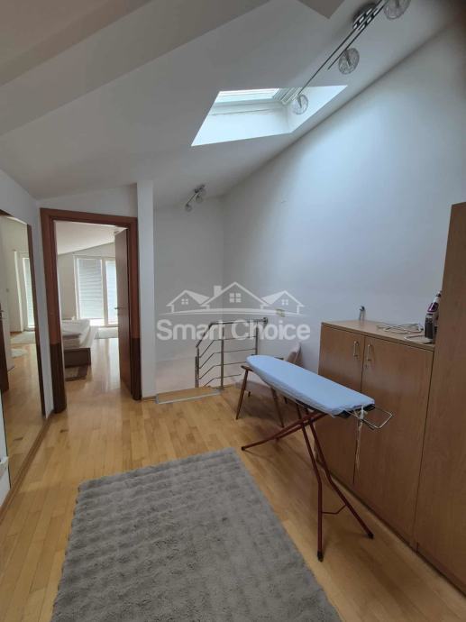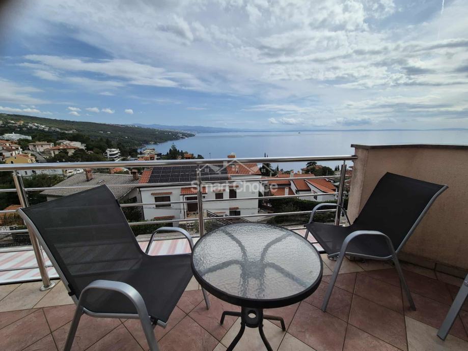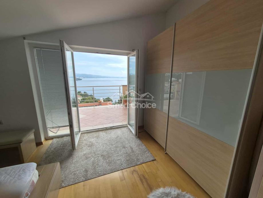 Volosko - prekrasan dvoetažni stan sa 2 balkona i terasom i prekrasnim pogledom na more, te 2 parkirna mjesta. Stan se sastoji od prostrane kuhinje sa dnevnim boravkom, kupaone i 2 balkona dolje, a na katu su smještene 3 spavaće sobe (od kojih jedna ima kupaonu), te lijepe velike terase. Stan ima 3 vrste grijanja (peć na pelete, klime i radijatori).