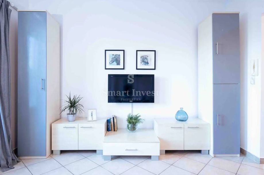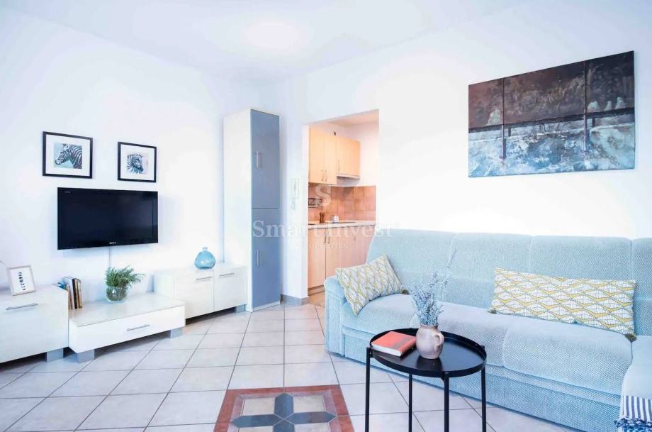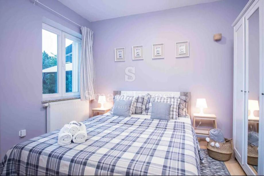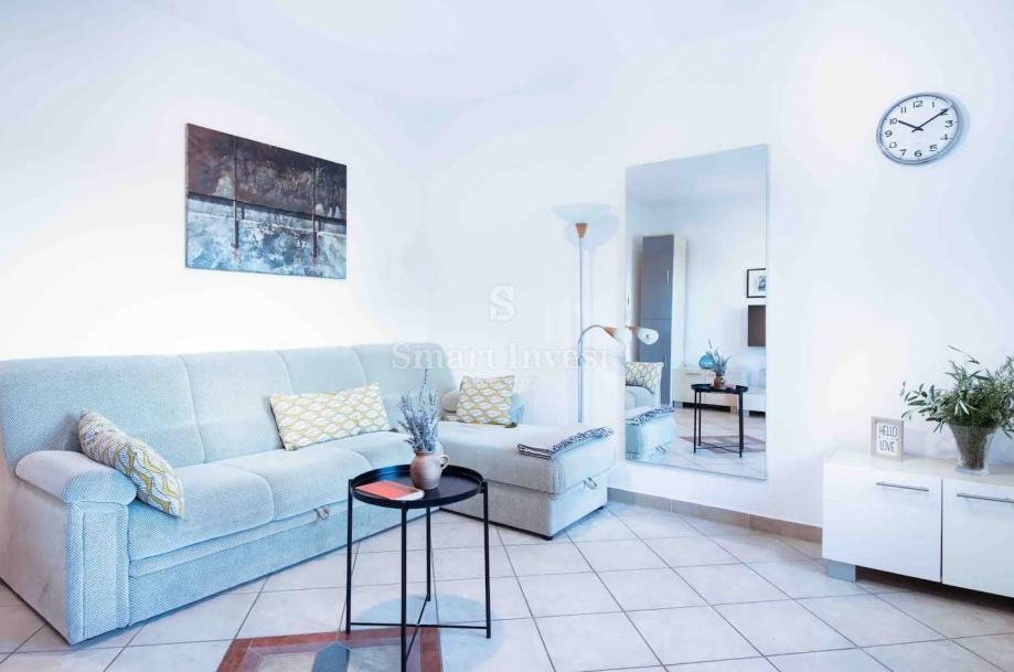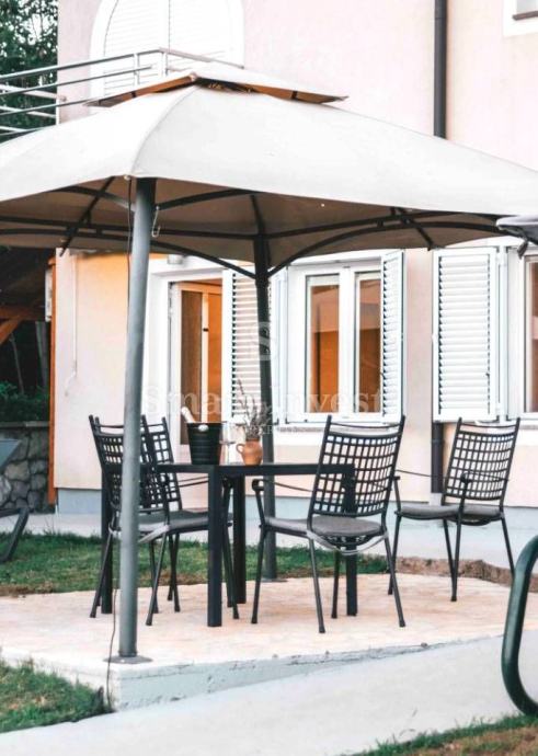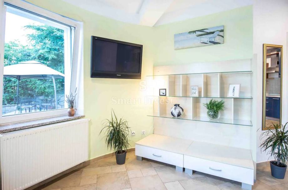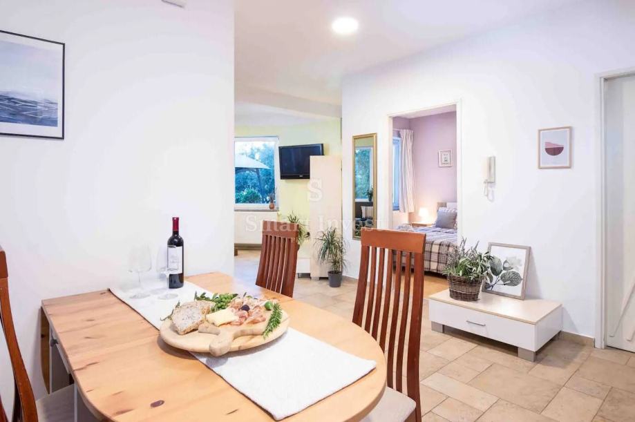 Nalazi se u prizemlju lijepe urbane vile te je trenutno podijeljena u 3 komforna apartmana (1S+DB, 2S+DB i studio apartman), od kojih svaki ima izlaz na terasu i okućnicu. Svaki apartman je etažiran i ima zasebni vlasnički list. Konoba je također pretvorena u studio apartman, tako da su u naravi 4 zasebna apartmana. Po želji kupca može se preurediti u jednu stambenu jedinicu.