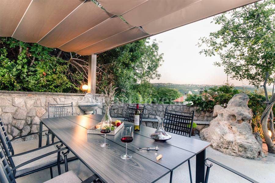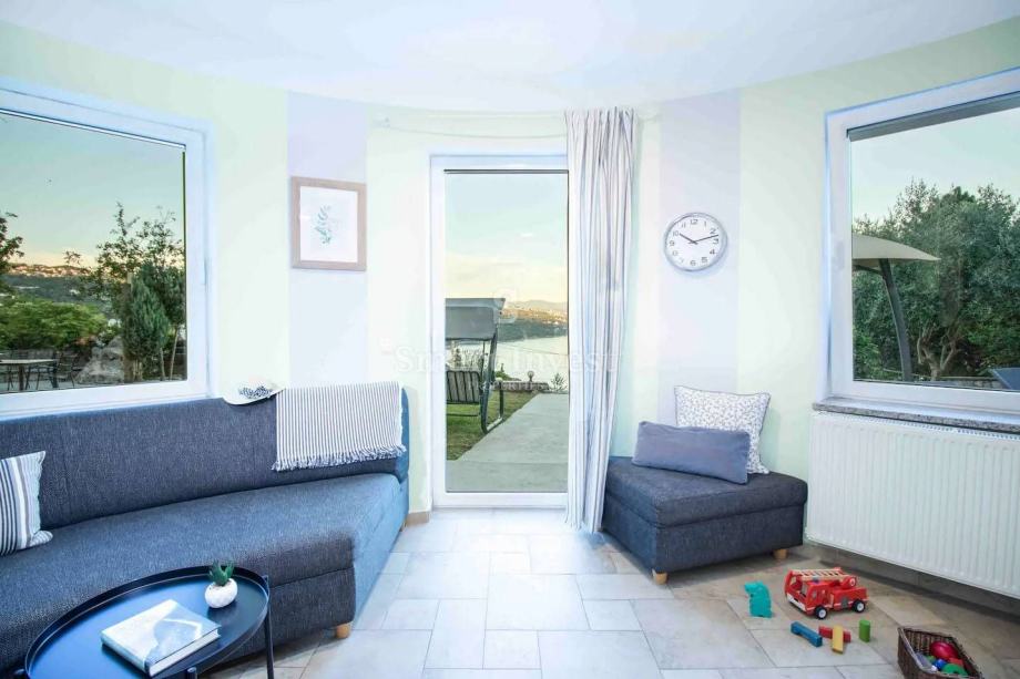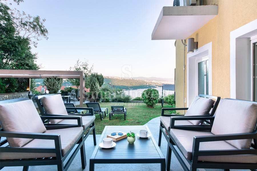 VOLOSKO, prodaje se prekrasno uređena etaža urbane vile ukupne površine 170 m2, s pripadajućom okućnicom od 500 m2 i 3 parkirna mjesta te pogledom na more.