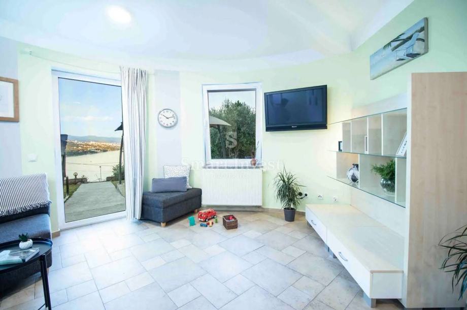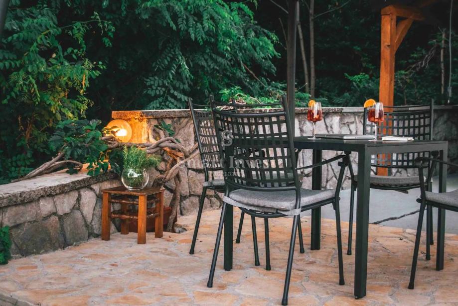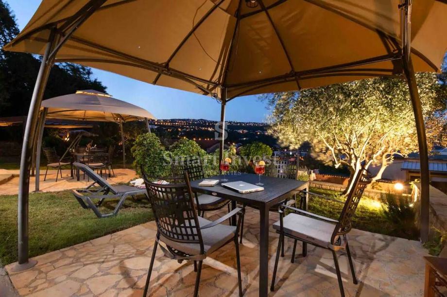Na okućnici s koje se pruža predivan pogled na more nalazi se nekoliko lijepo uređenih terasa te je moguća izgradnja bazena i 3 parkirna mjesta.