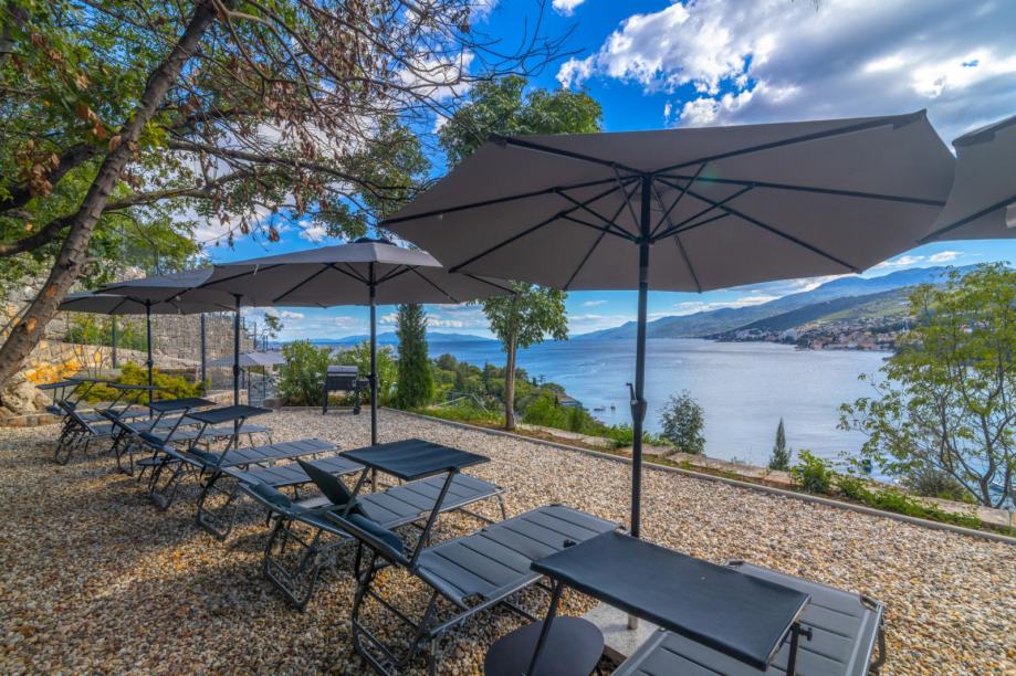 Osim vlastitog vrta, na zajedničkoj okućnici od 3149 m2, prekrasno uređenoj kaskadne izvedbe, smjestio bazen od 60 m2 sa sunčalištem koji koriste vlasnici ostalih jedinica sa predivnim pogledom na Opatijsku rivijeru, Učku i Kvarner.