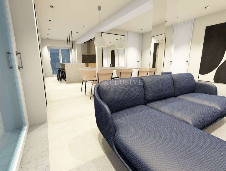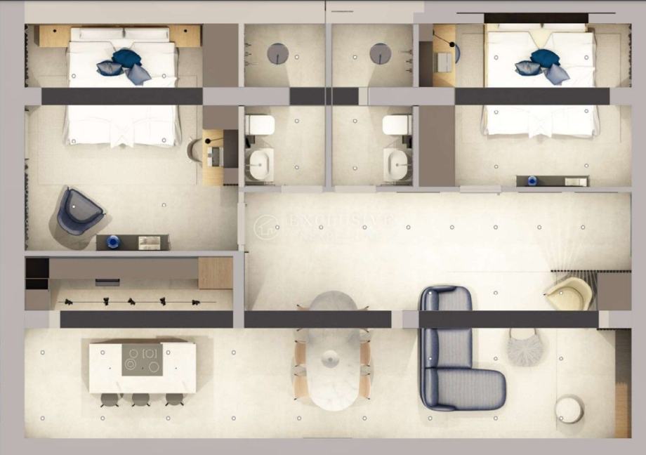 Neto površina samog stana iznosi 82 m2, a sastoji se od kuhinje, velikog dnevnog boravka s blagovaonicom, dvije spavaće sobe i dvije kupaonice.