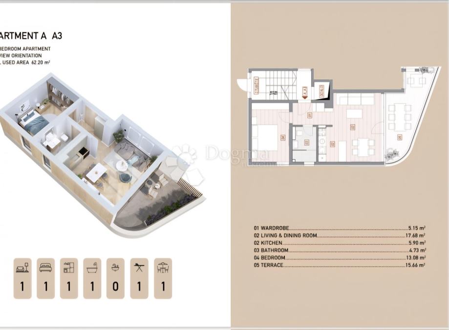 Ekskluzivni stan A3 korisna površina: 48,8m² + 15,7 m² terase = ukupno 64,5 m². Zgrada A, 1. kat. Dio prestižnog projekta s 12 stanova u dvije zgrade. Useljivo 2026