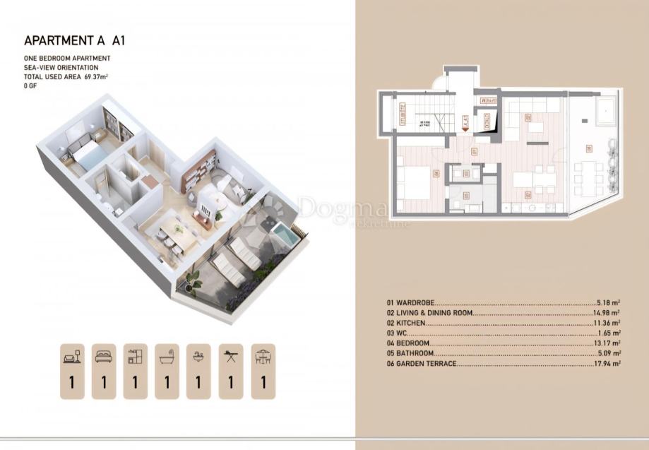Ekskluzivni stan A1 korisna površina: 51,4m2 m² + 17,9 m² terase = ukupno 69,4 m². Zgrada A, 0. kat. Dio prestižnog projekta s 12 stanova u dvije zgrade. Useljivo 2026